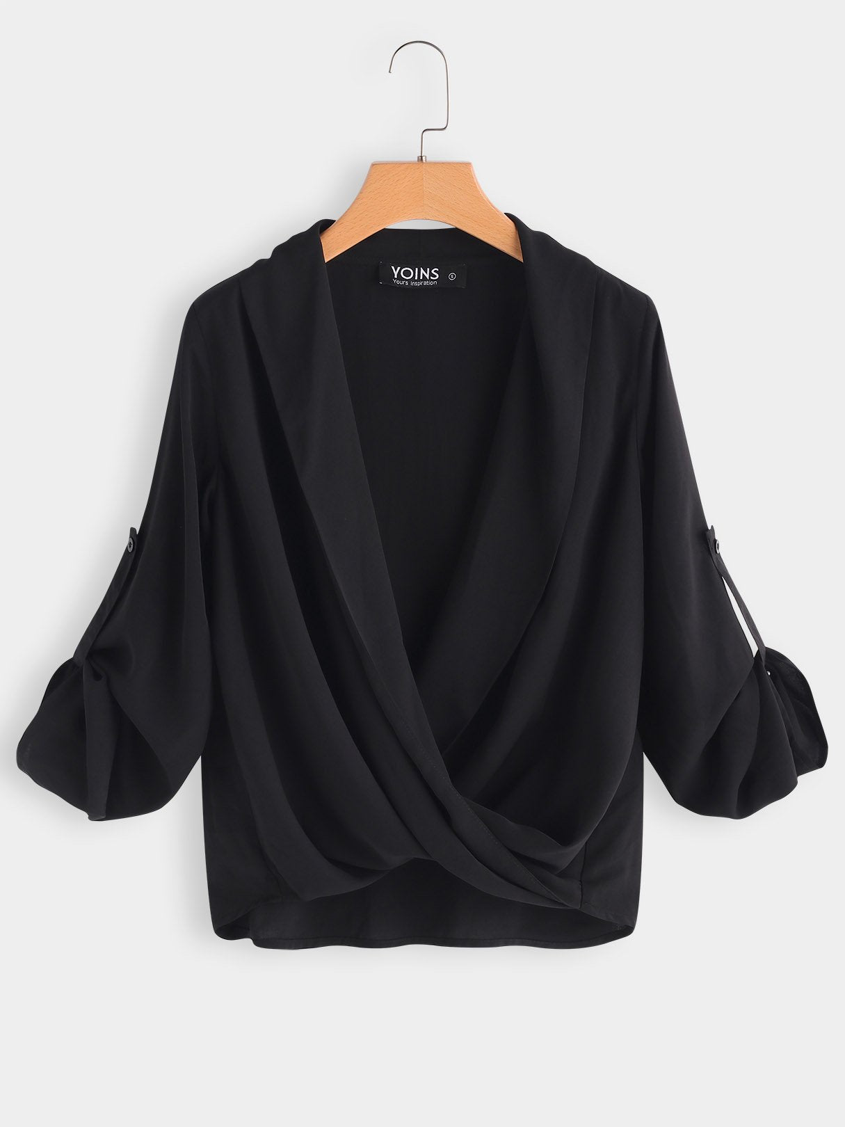 Deep V Neck Plain Crossed Front 3/4 Sleeve Black Blouses