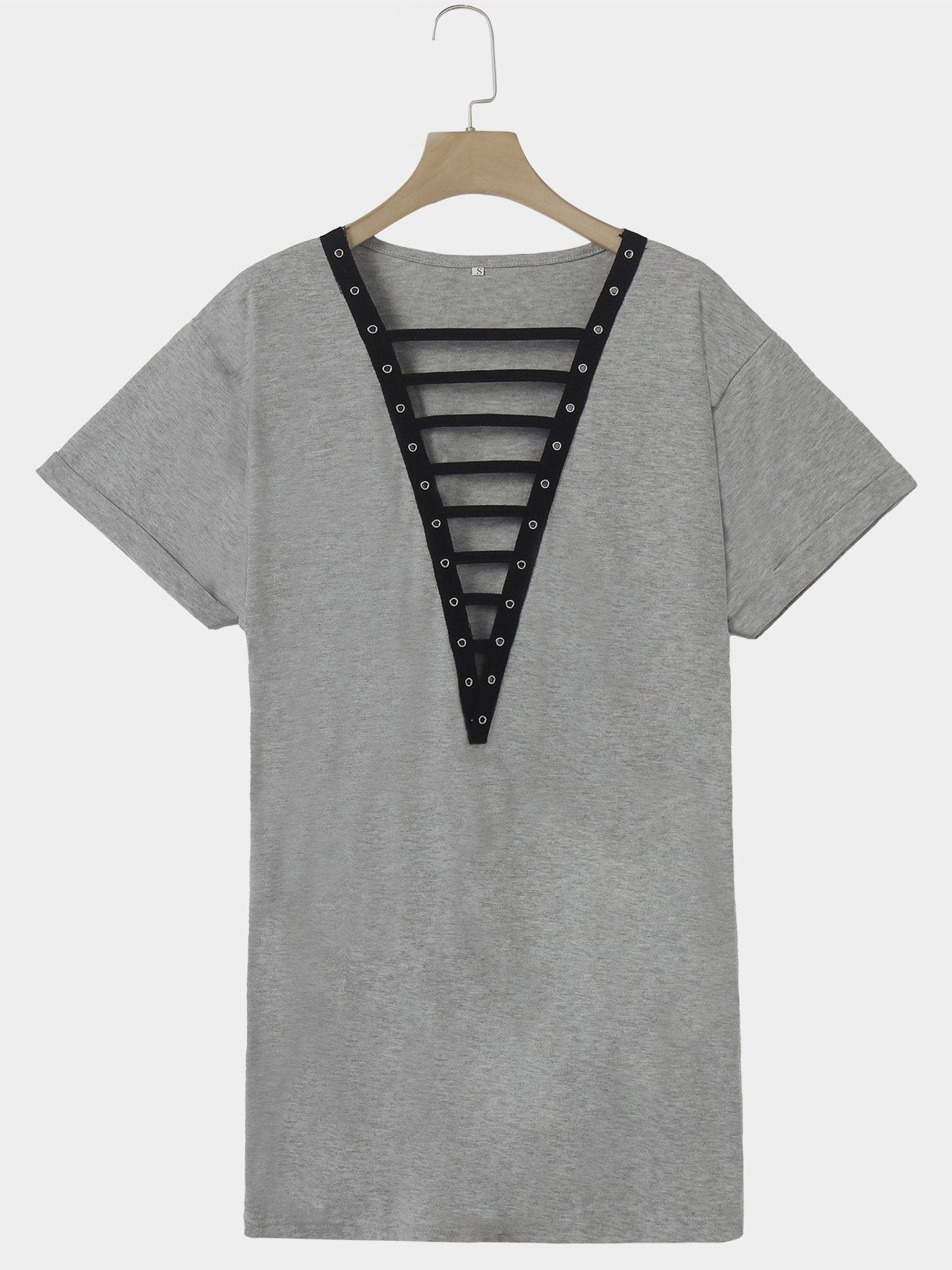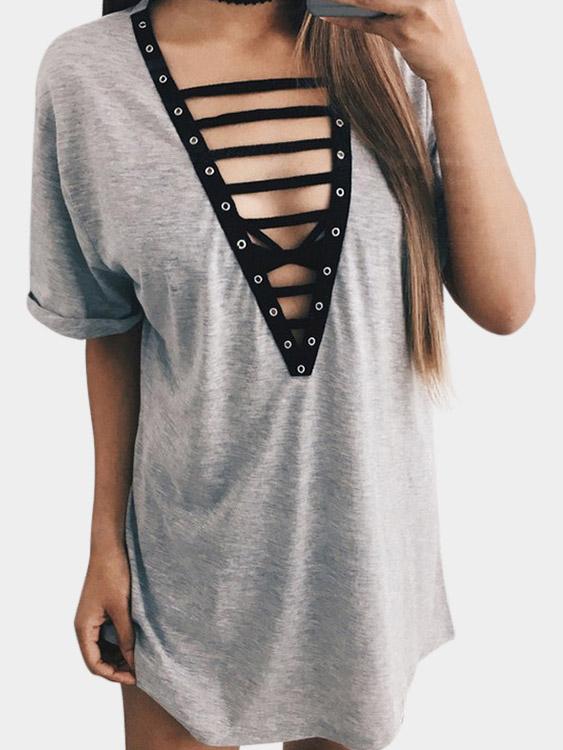 Deep V Neck Random Ripped Lace-Up Short Sleeve Grey Dress