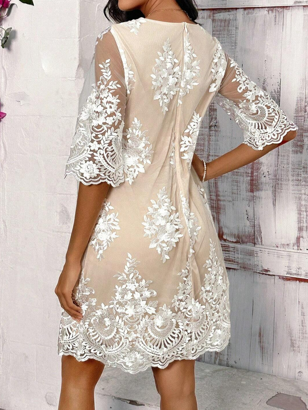 Elegant Half Sleeve Crew Neck Plain Embroidery Loose Midi Dress