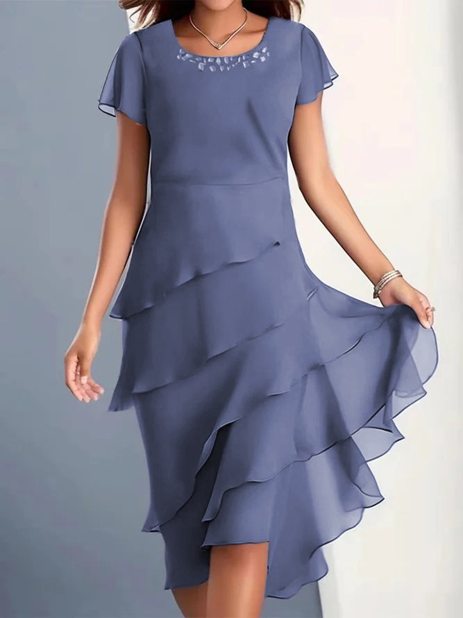 Elegant Short Sleeve Crew Neck Plain Midi Dress - Purplish Blue / S is backordered and will ship as soon as it is back in stock.