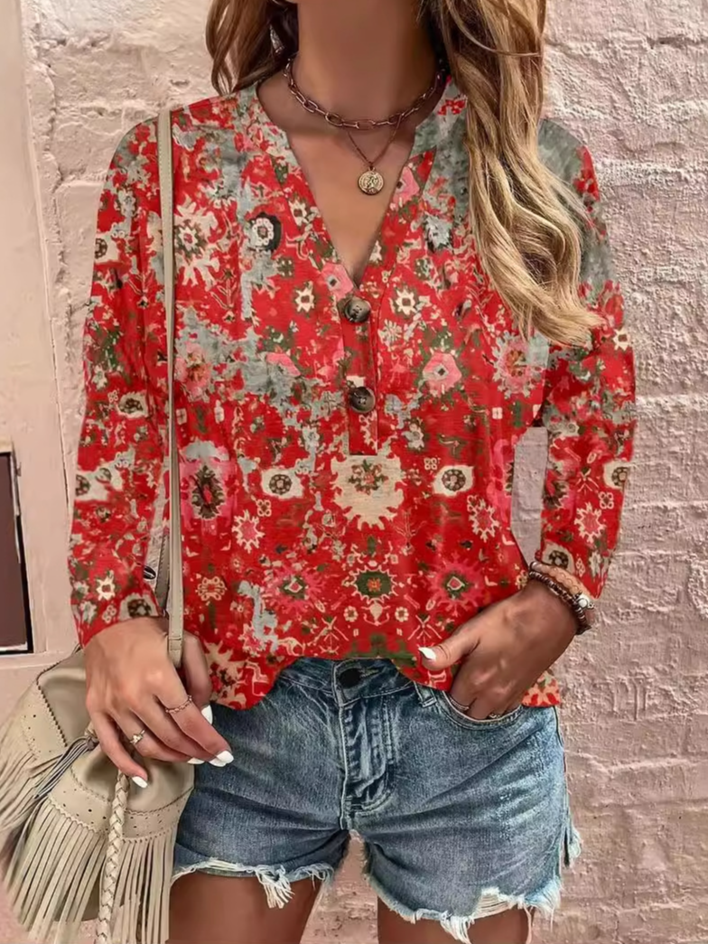 Fashion V Neck Long Sleeve Ethnic Casual Regular Blouses - Orange / S is backordered and will ship as soon as it is back in stock.