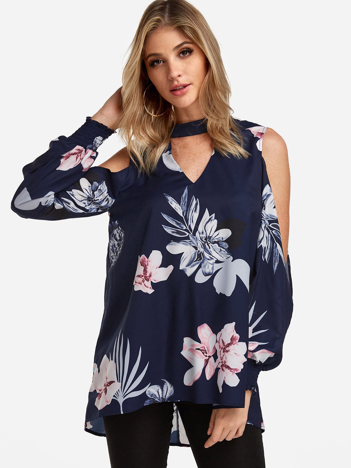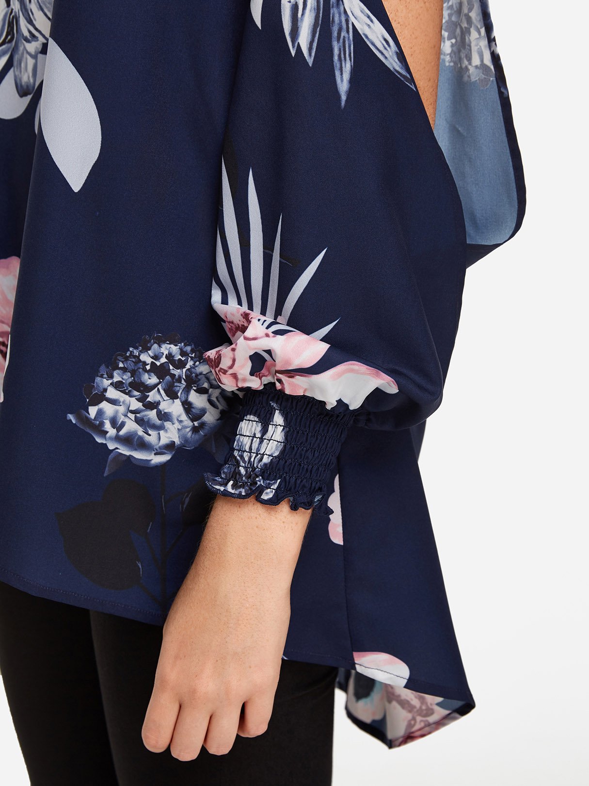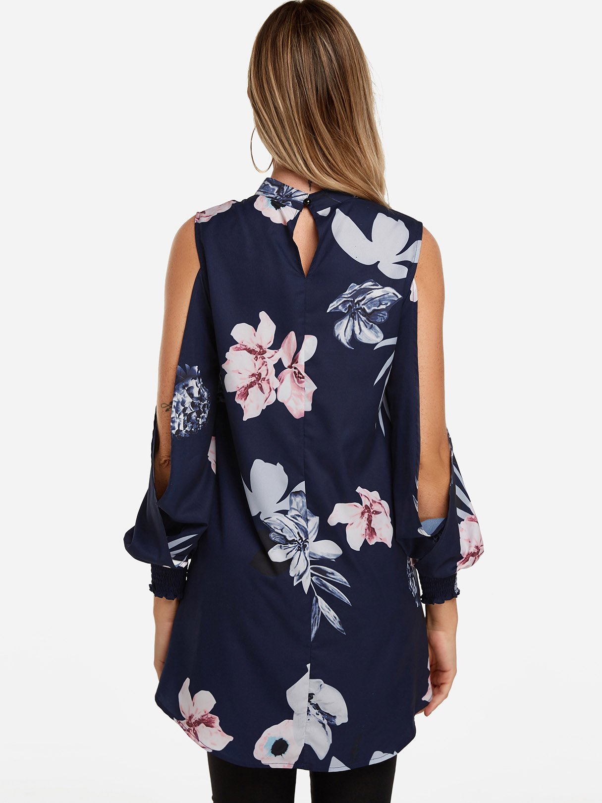 Floral Print Cut Out Long Sleeve Irregular Hem Navy Blouses