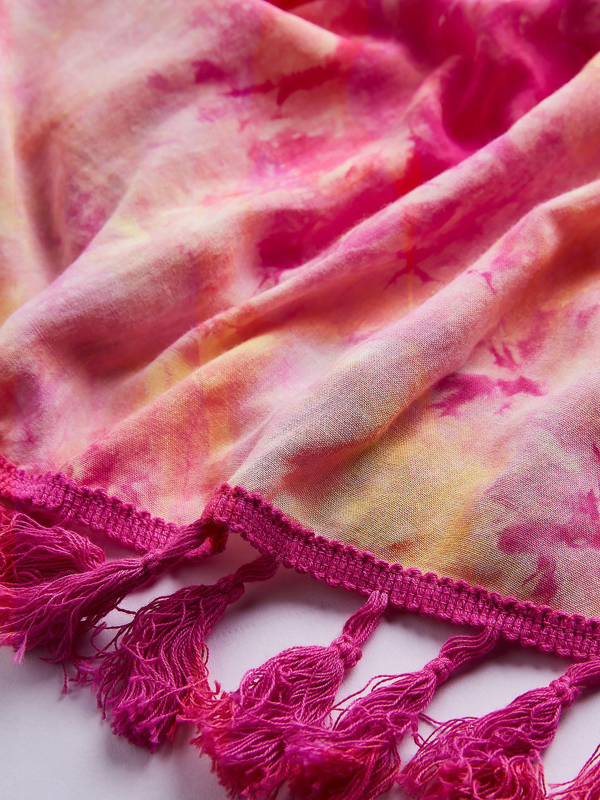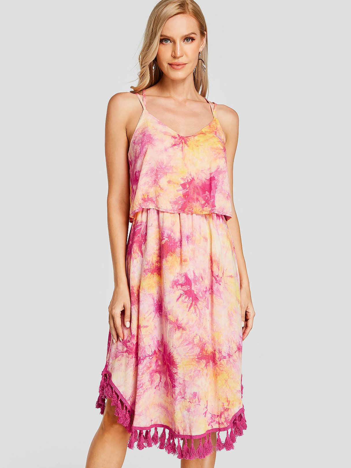 Fuchsia V-Neck Sleeveless Tassel Pleated Spaghetti Strap Tassel Hem Midi Dresses