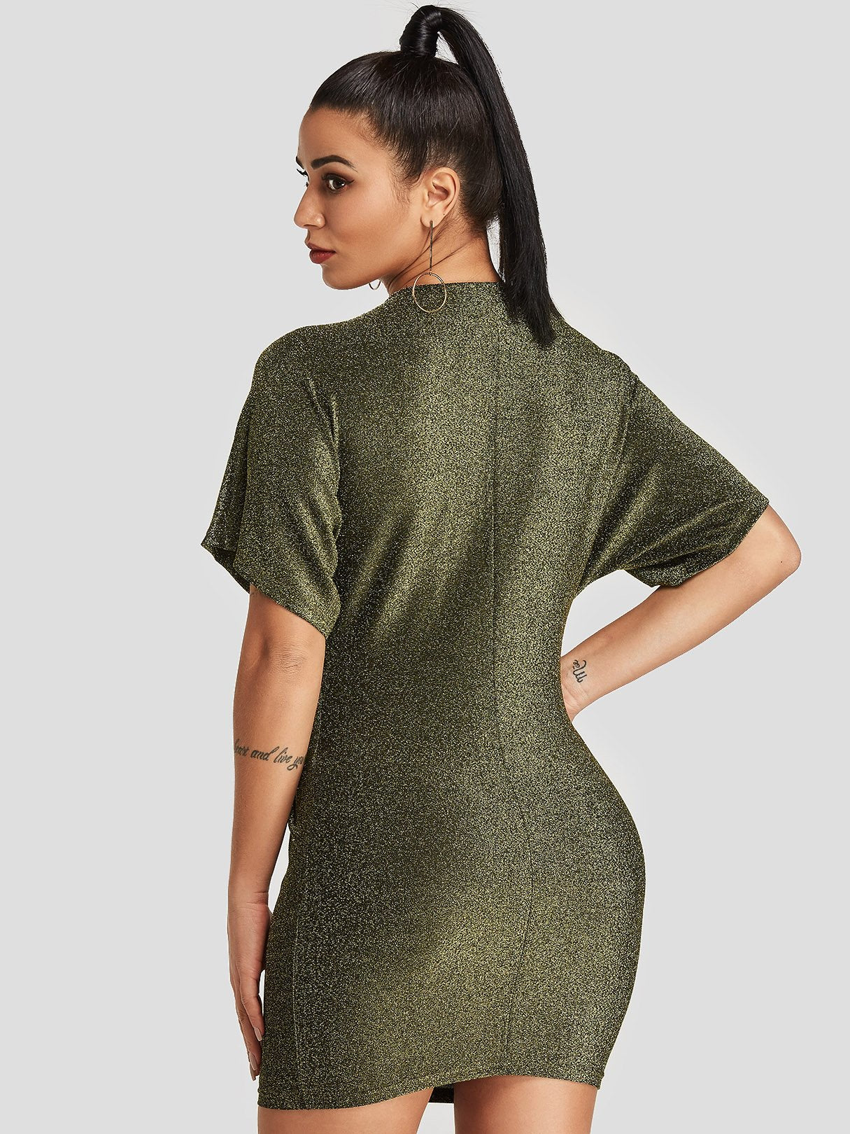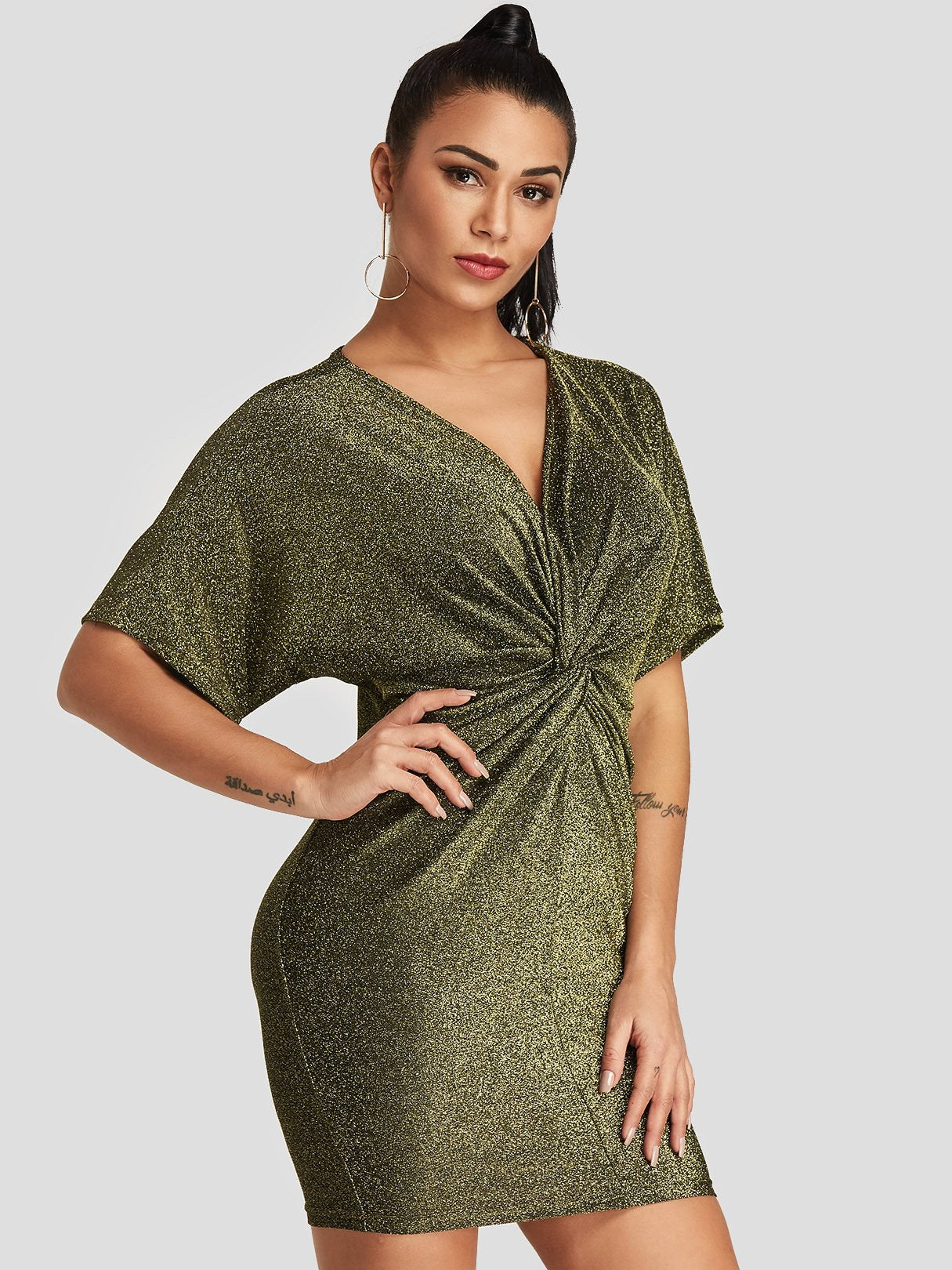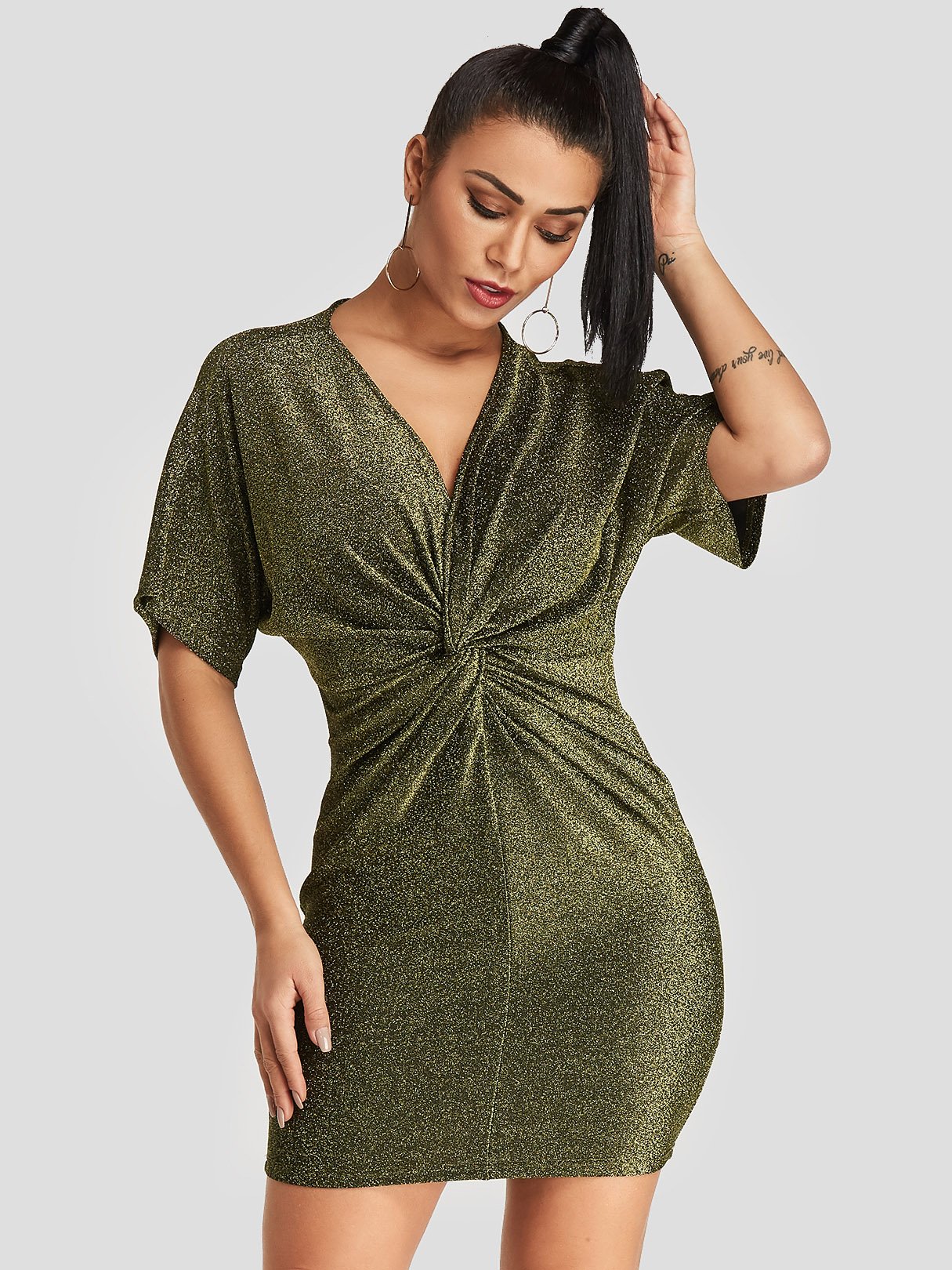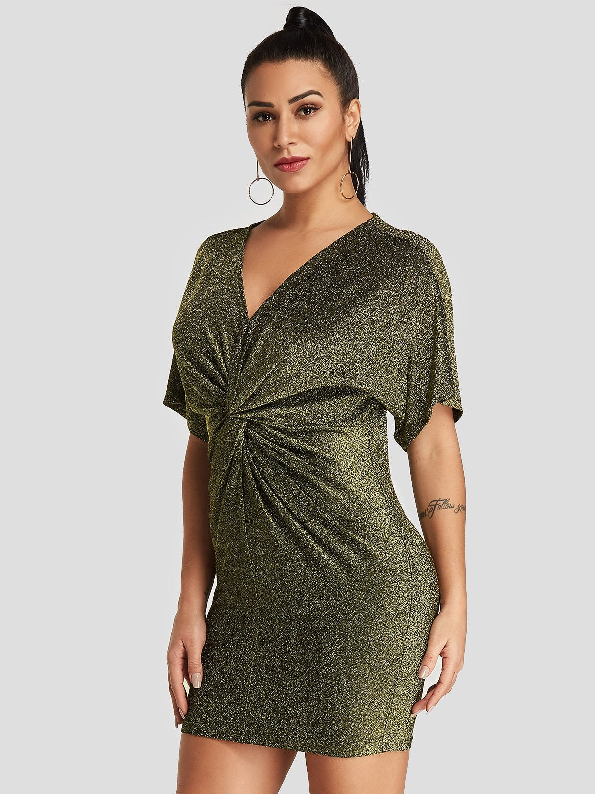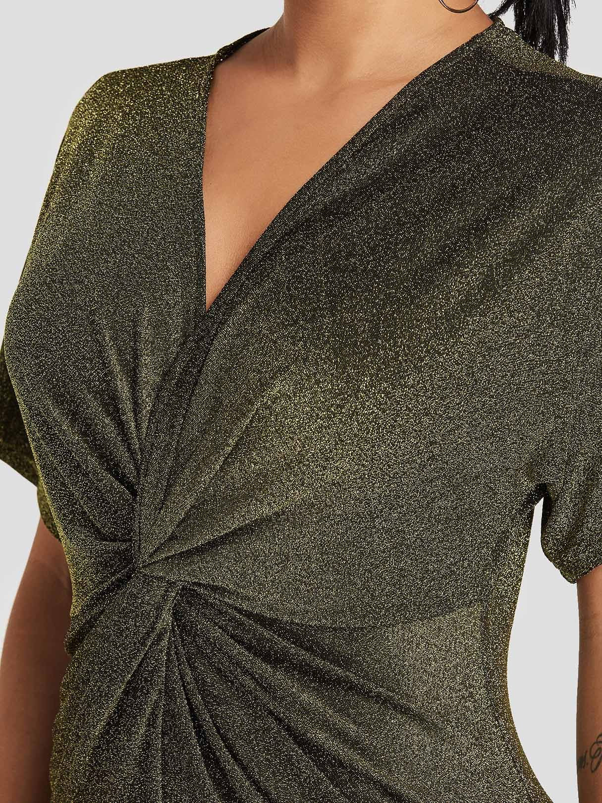 Gold V-Neck Short Sleeve Plain Bodycon Dresses - Gold / S is backordered and will ship as soon as it is back in stock.