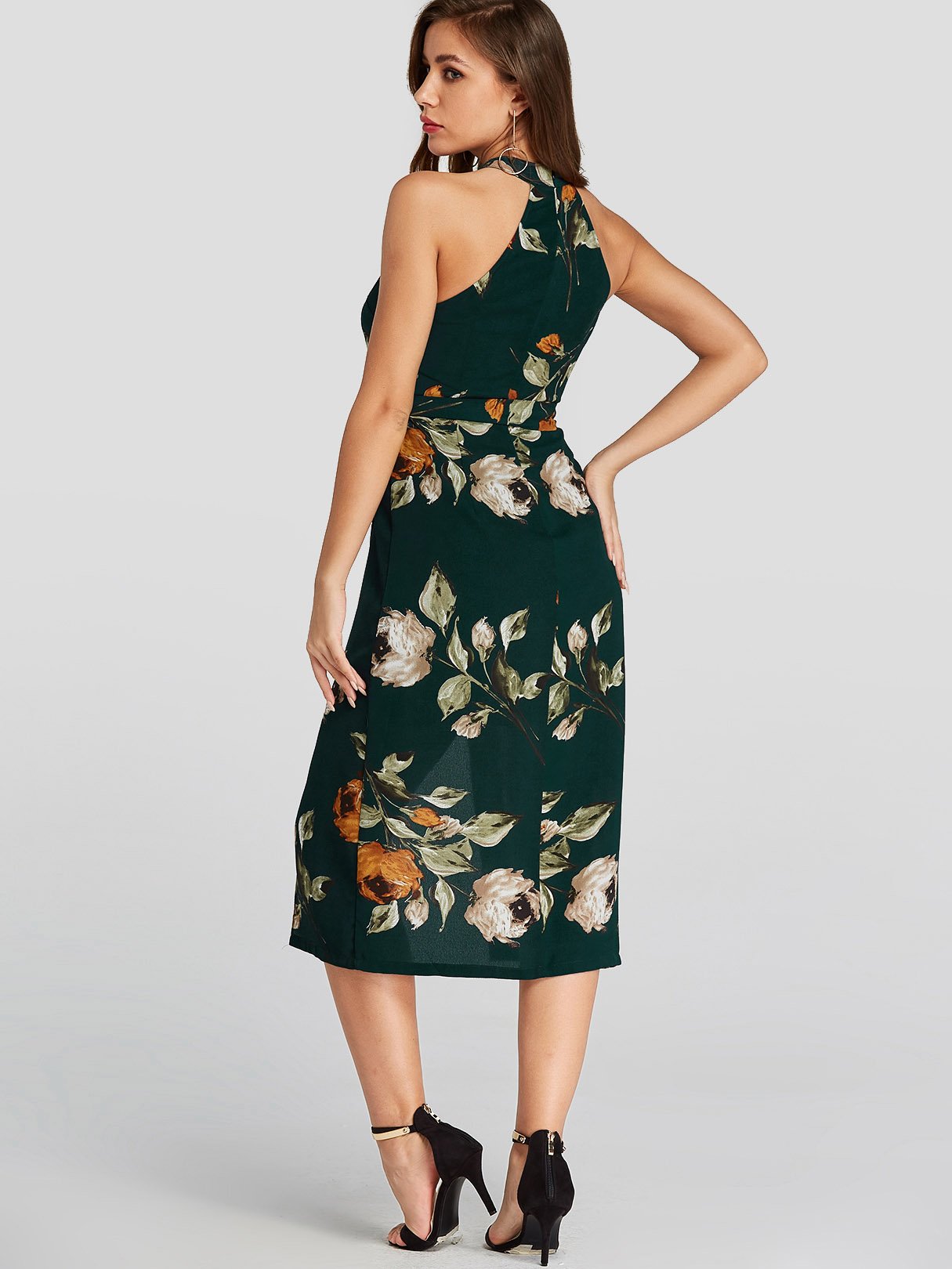 Material:PolyesterNeckline:HalterSeason:Spring,SummerSleeves:SleevelessPattern:Floral PrintStyle:Casual StyleDetail:Slit Design,Self-Tie DesignWaist Design:High-WaistedHem Design:Slit HemLength:MidiFit:Regular FitOccasion:Wedding Guest