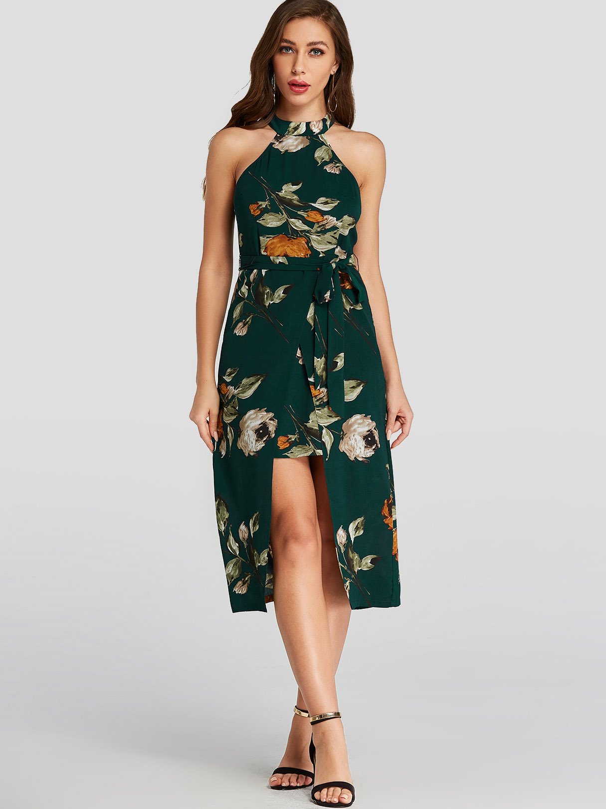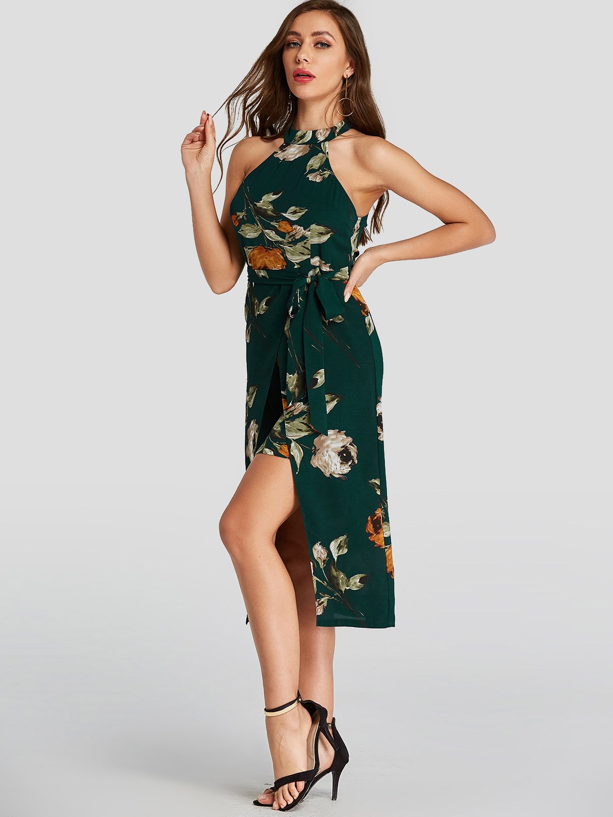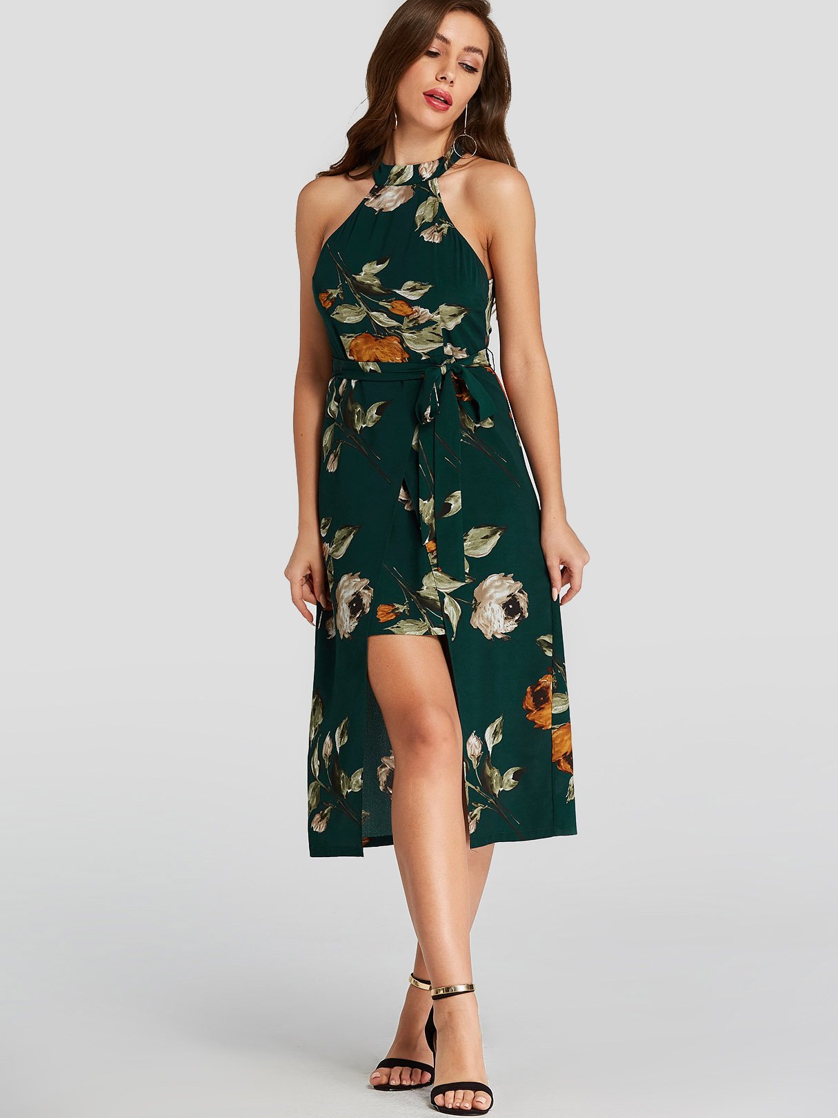 Green Halter Sleeveless Floral Print Self-Tie Slit Hem Dresses - Green / S is backordered and will ship as soon as it is back in stock.