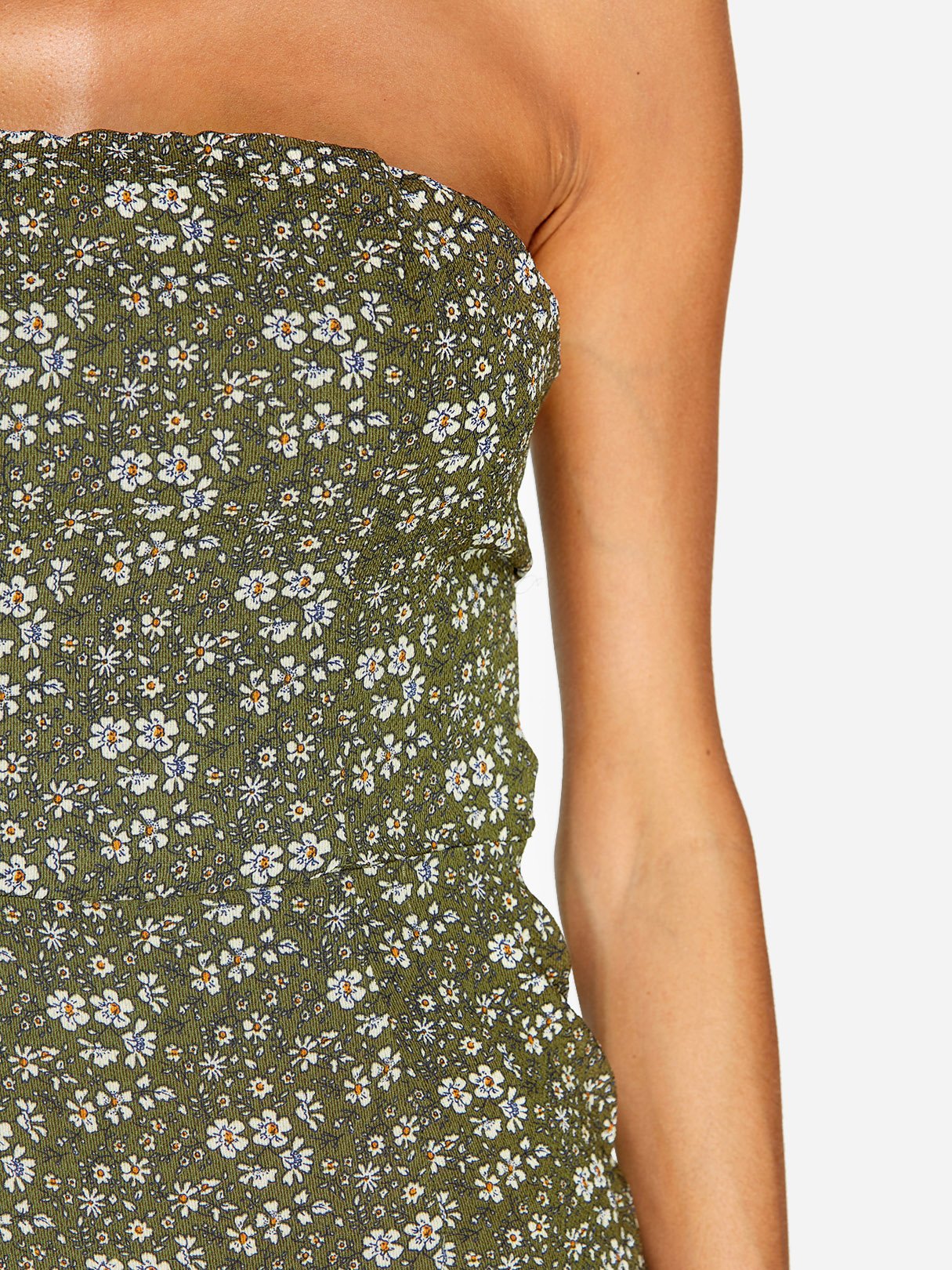 Green Strapless Sleeveless Floral Print Backless Self-Tie Flounced Hem Dresses