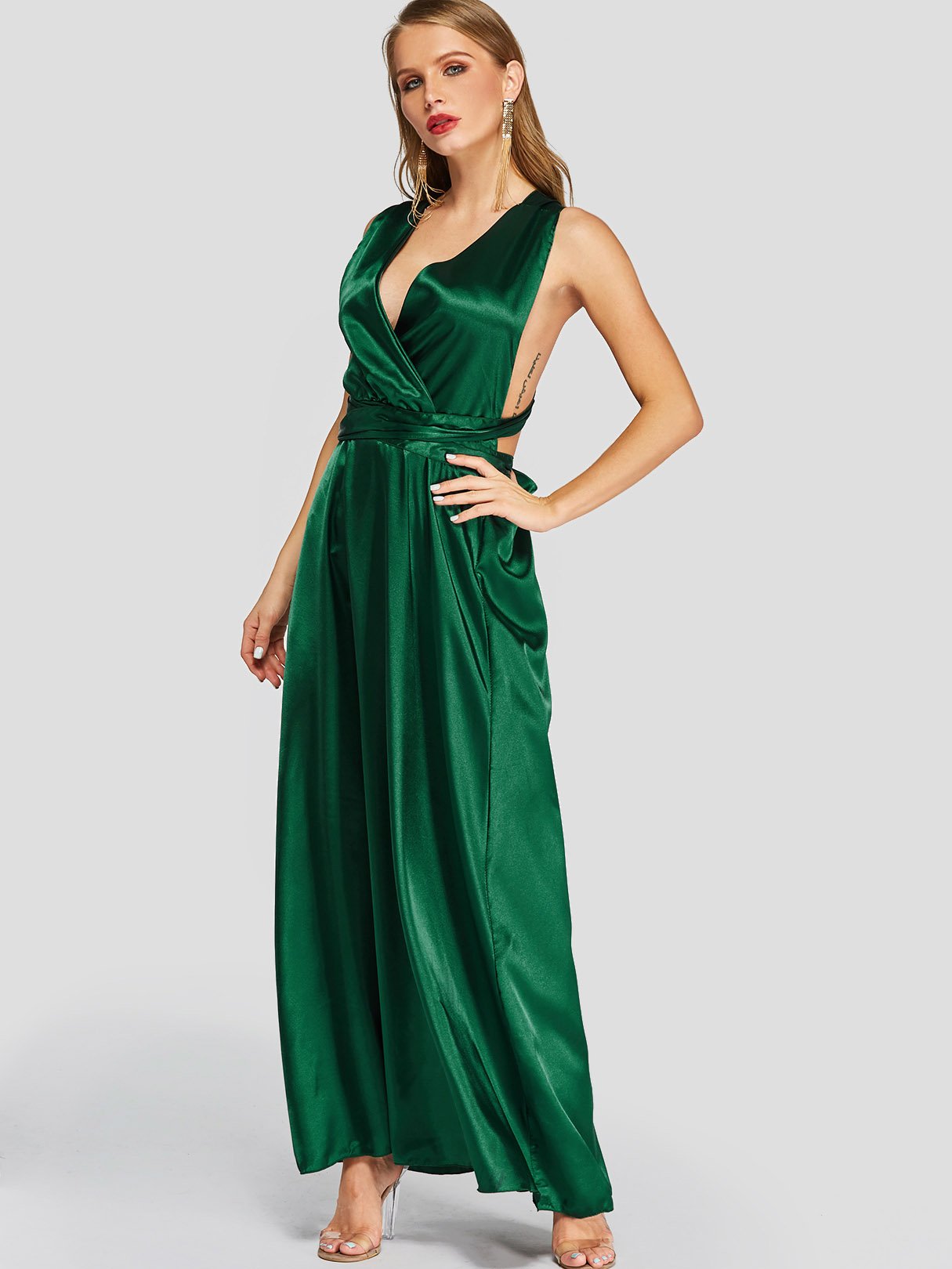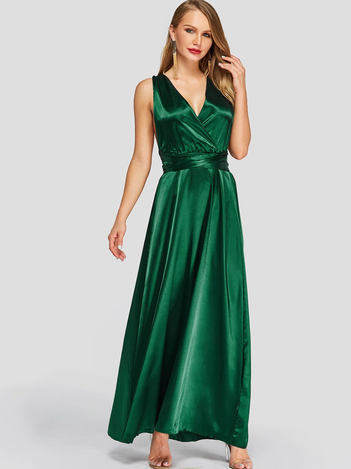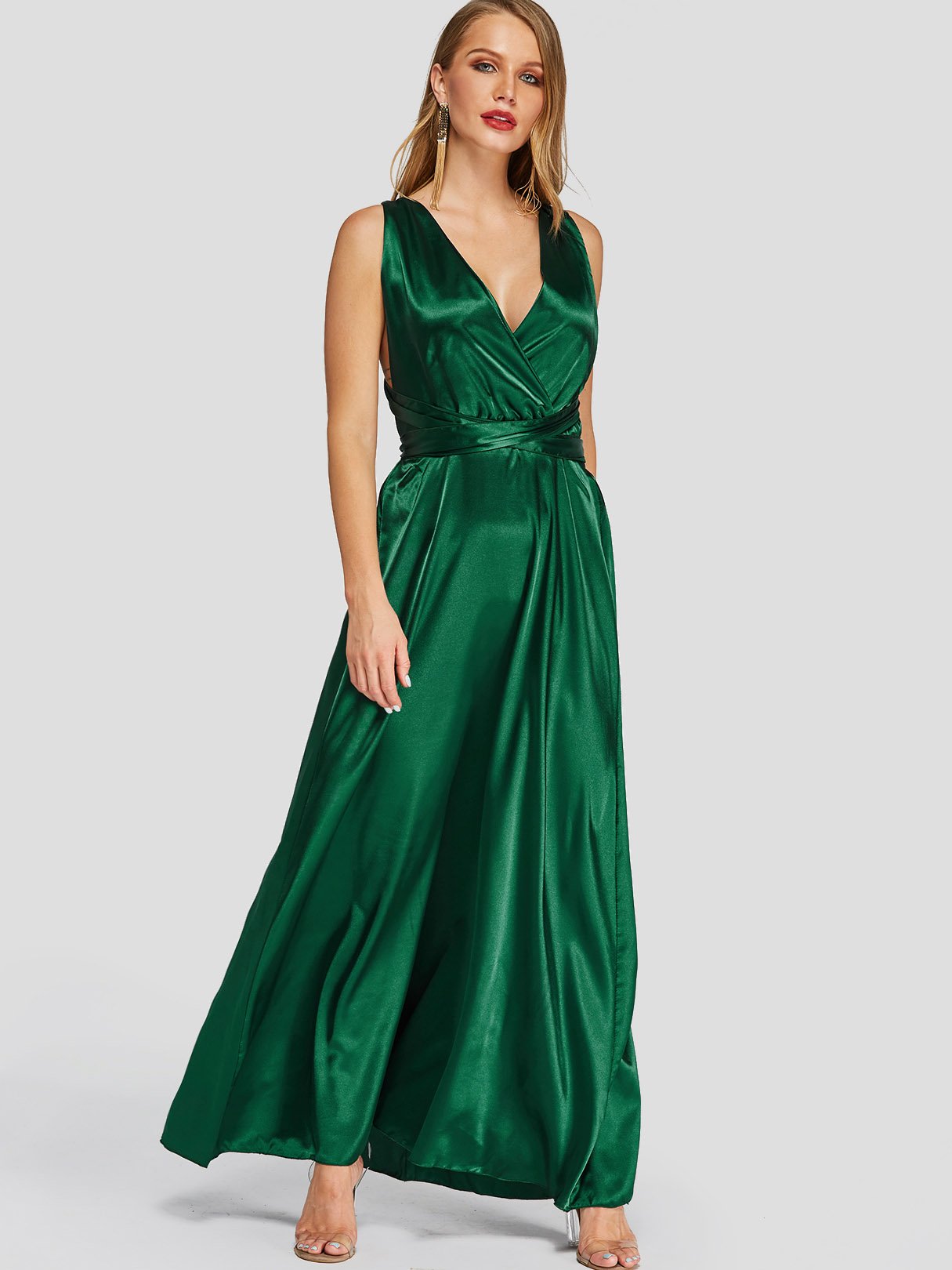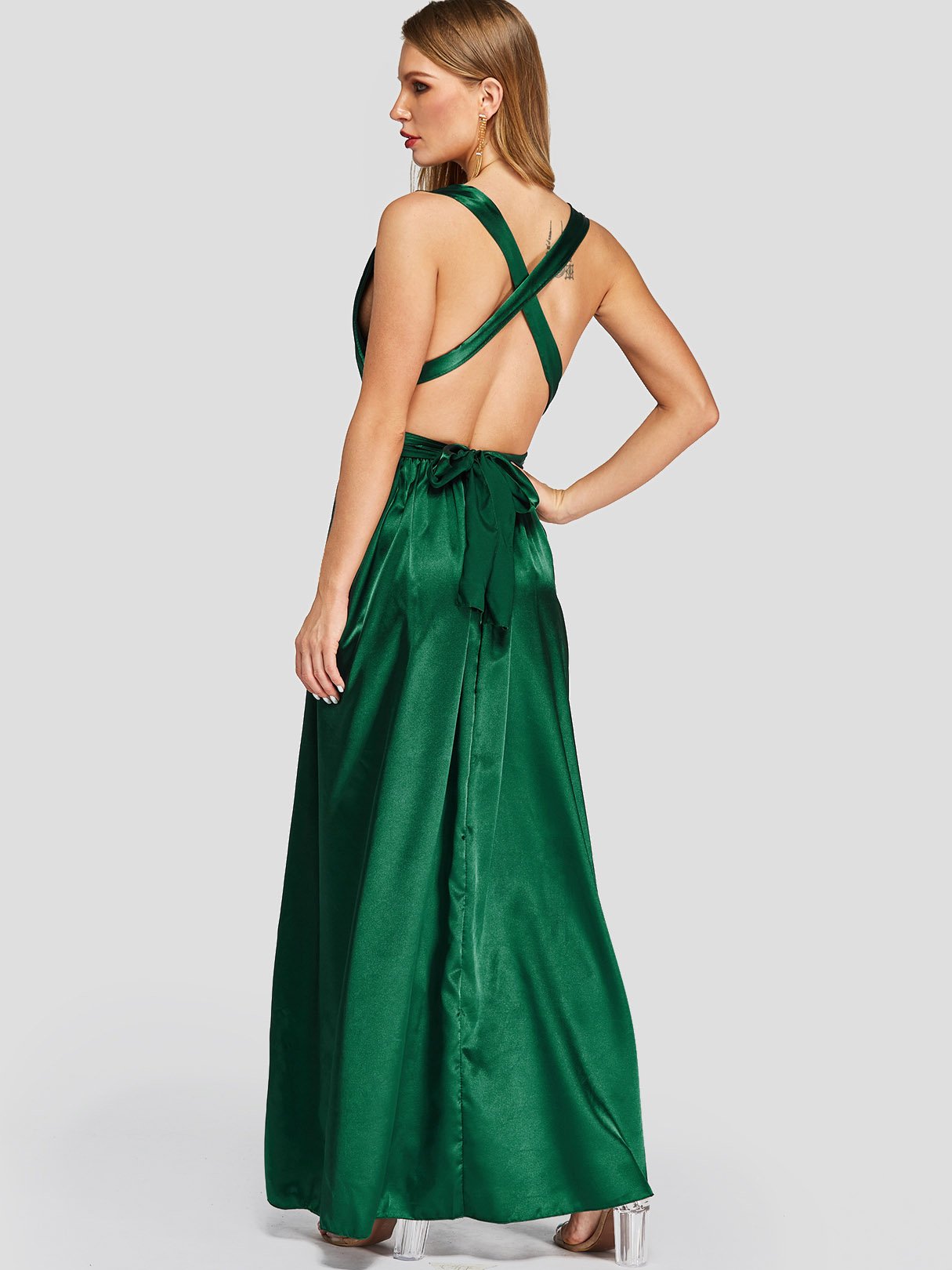 Green V-Neck Crossed Collar Sleeveless Backless Lace-Up Self-Tie Criss-Cross Maxi Dresses