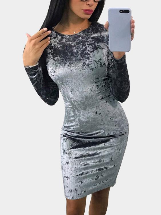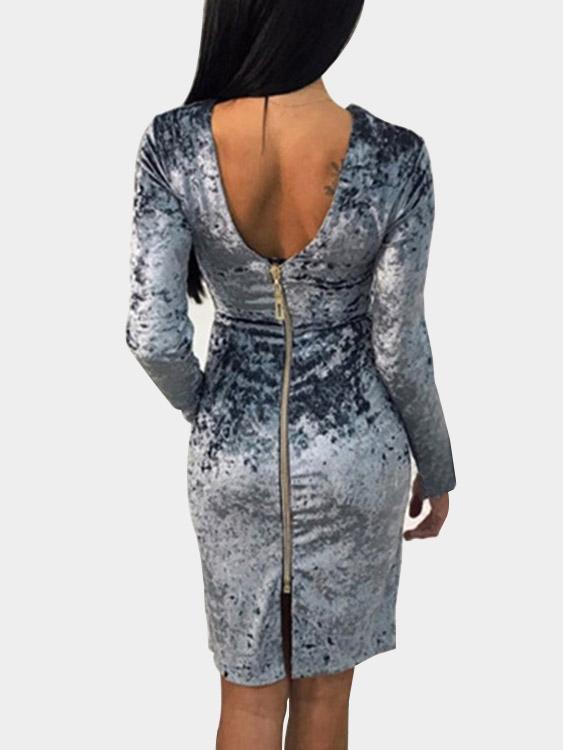 Grey Deep V-Neck Long Sleeve Plain Zip Back Slit Midi Dress
