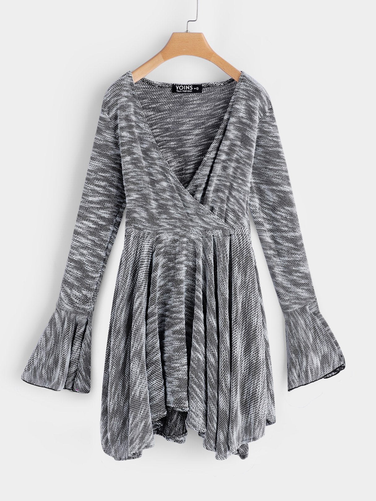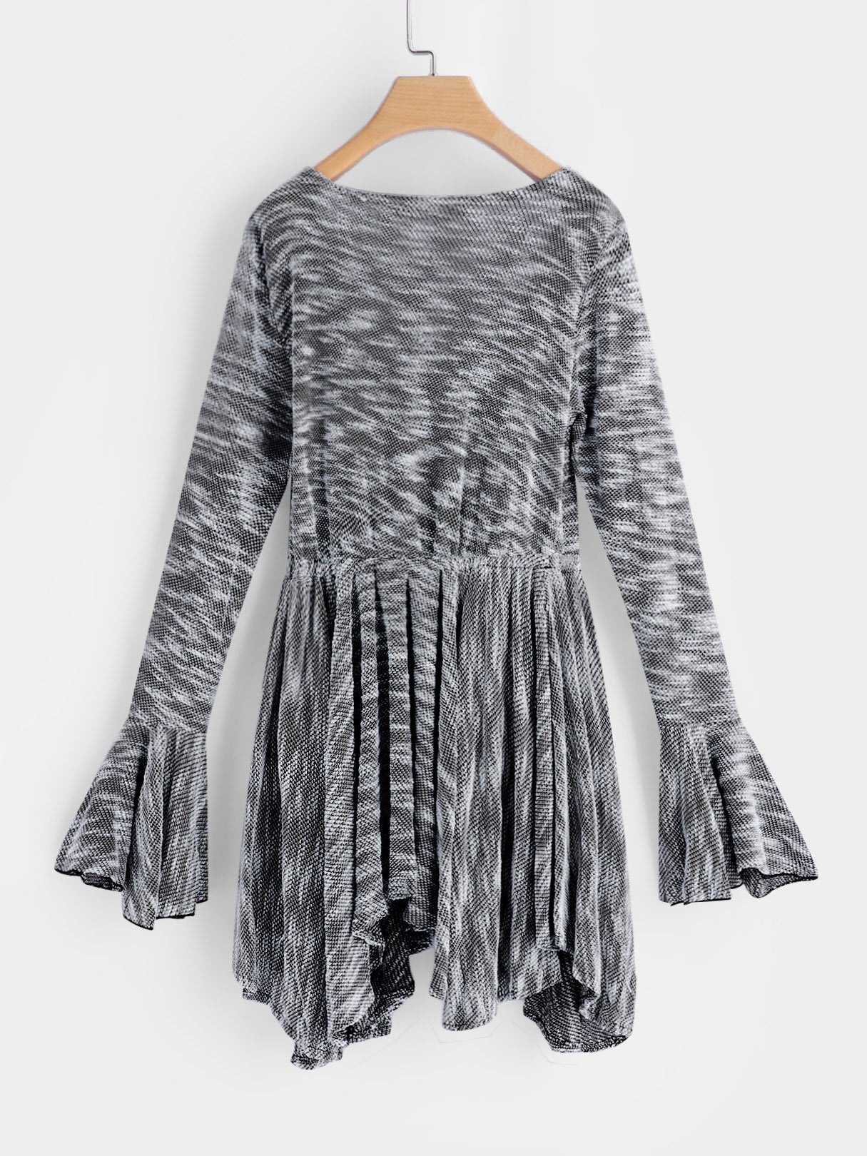 Material:Cotton,PolyesterNeckline:V-NeckSeason:Spring,Autumn,WinterSleeves:Long SleevesPattern:PlainStyle:Sexy StyleWaist Design:Middle-WaistedHem Design:Irregular HemLength:MiniFit:Regular FitSleeves Type:Bell Sleeves