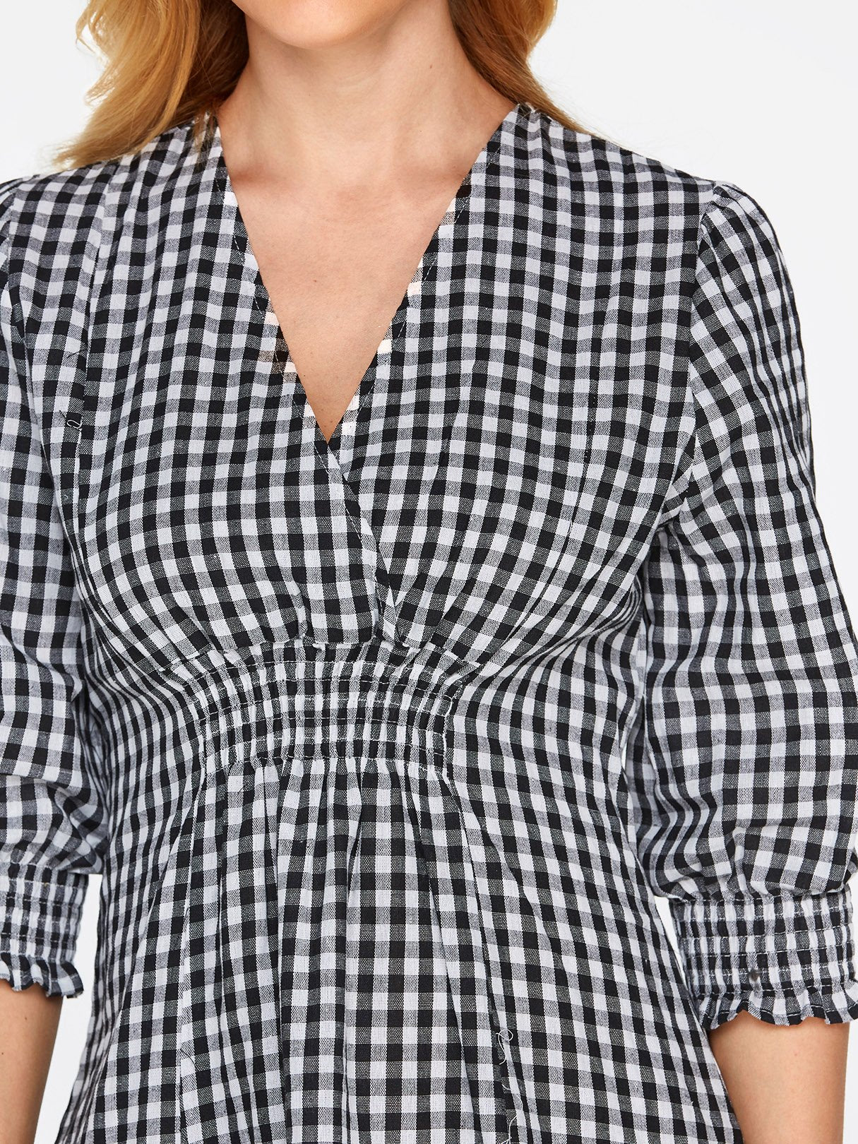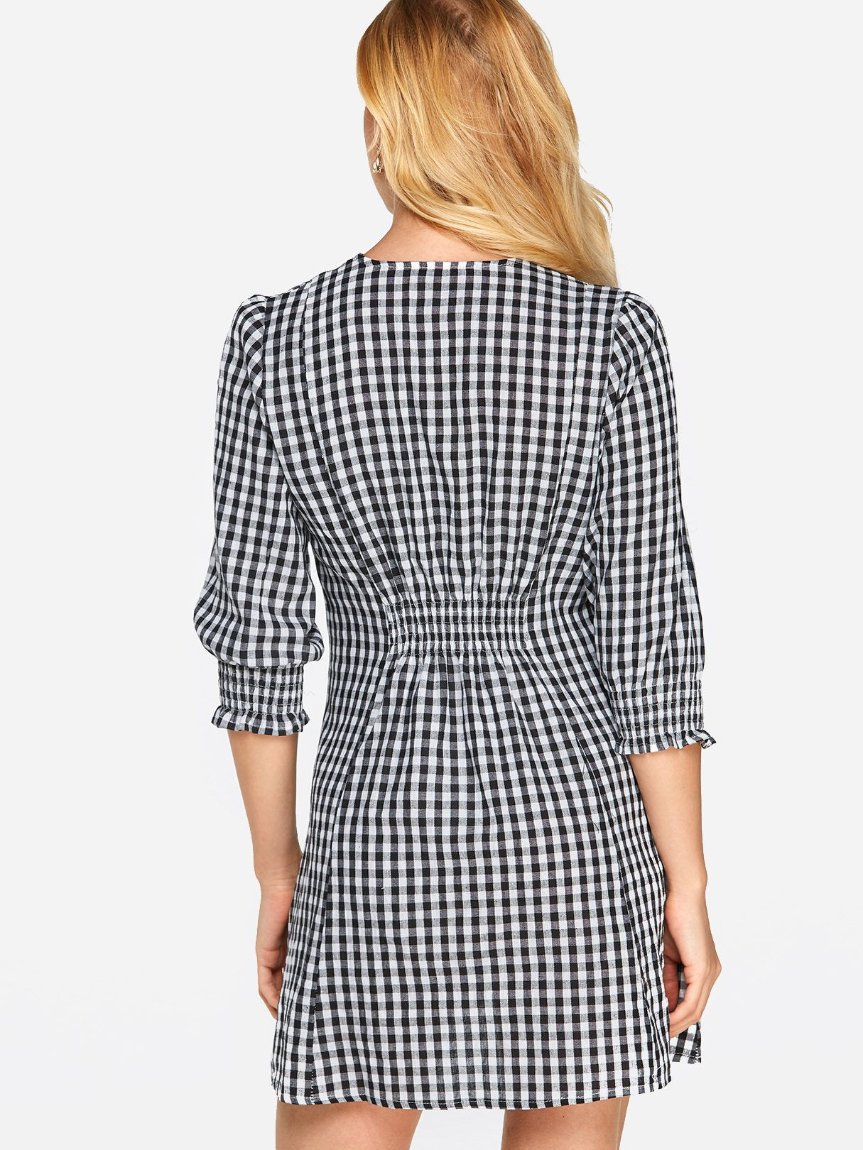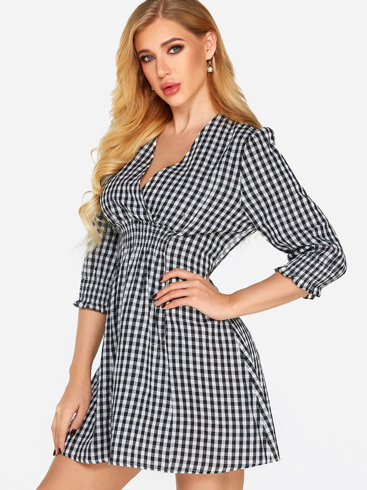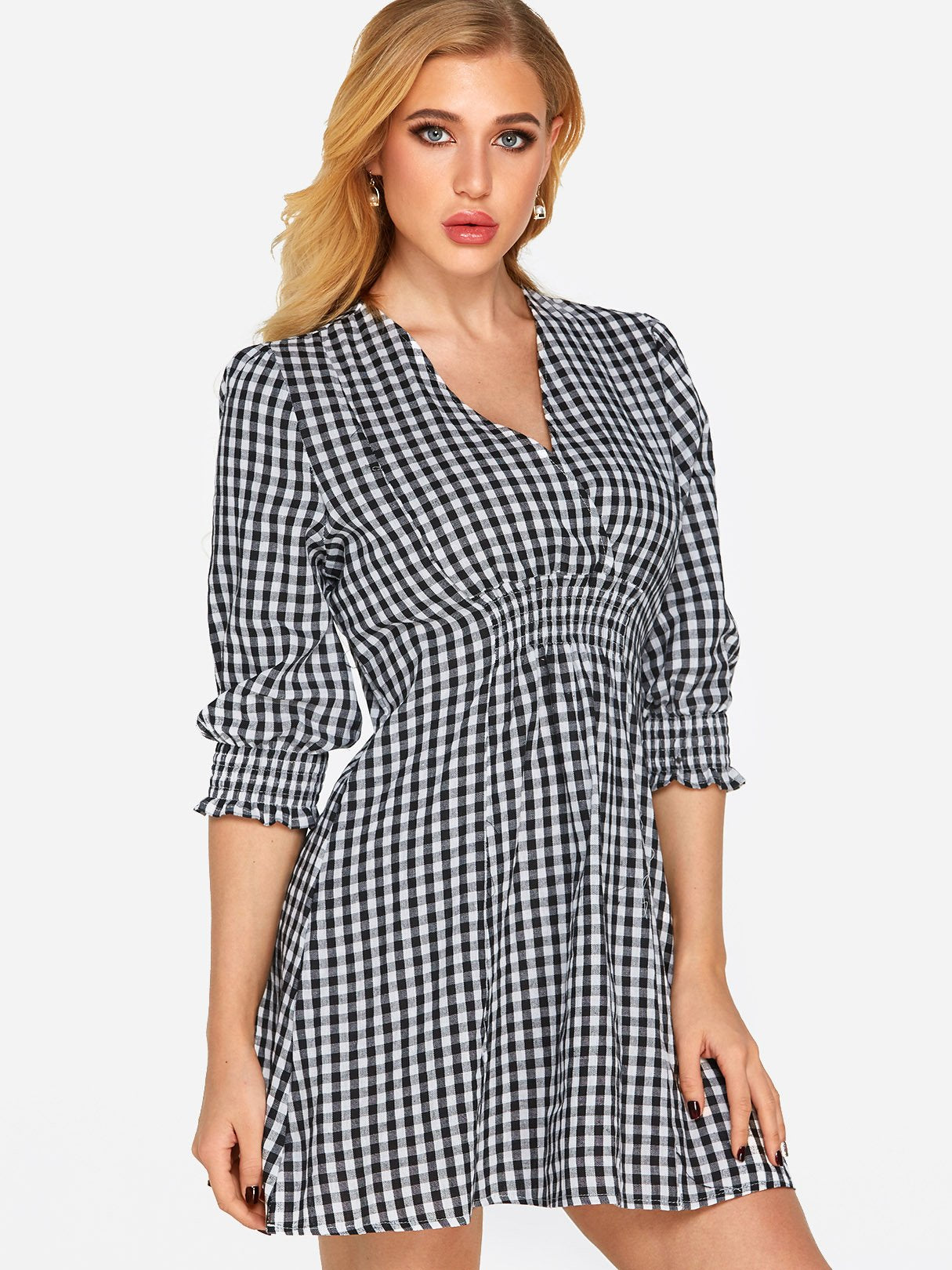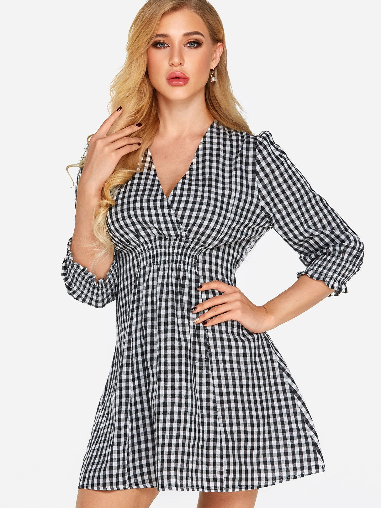 Grid V-Neck Crossed Collar Half Sleeve Grid Sexy Dresses