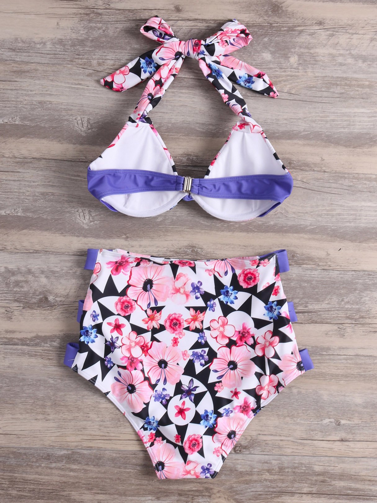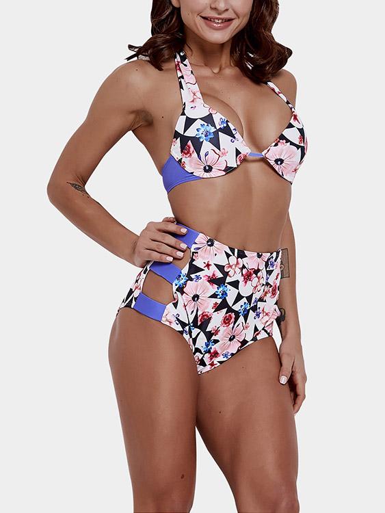 Halter Floral Print Cut Out Tie-Up Sleeveless High-Waisted Purple Bikini Set