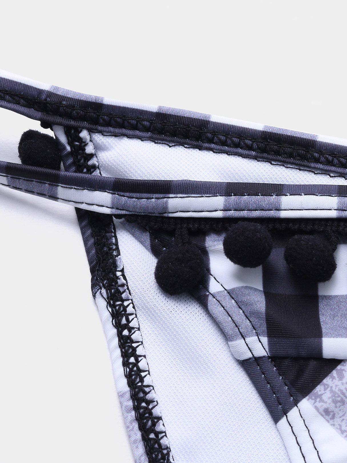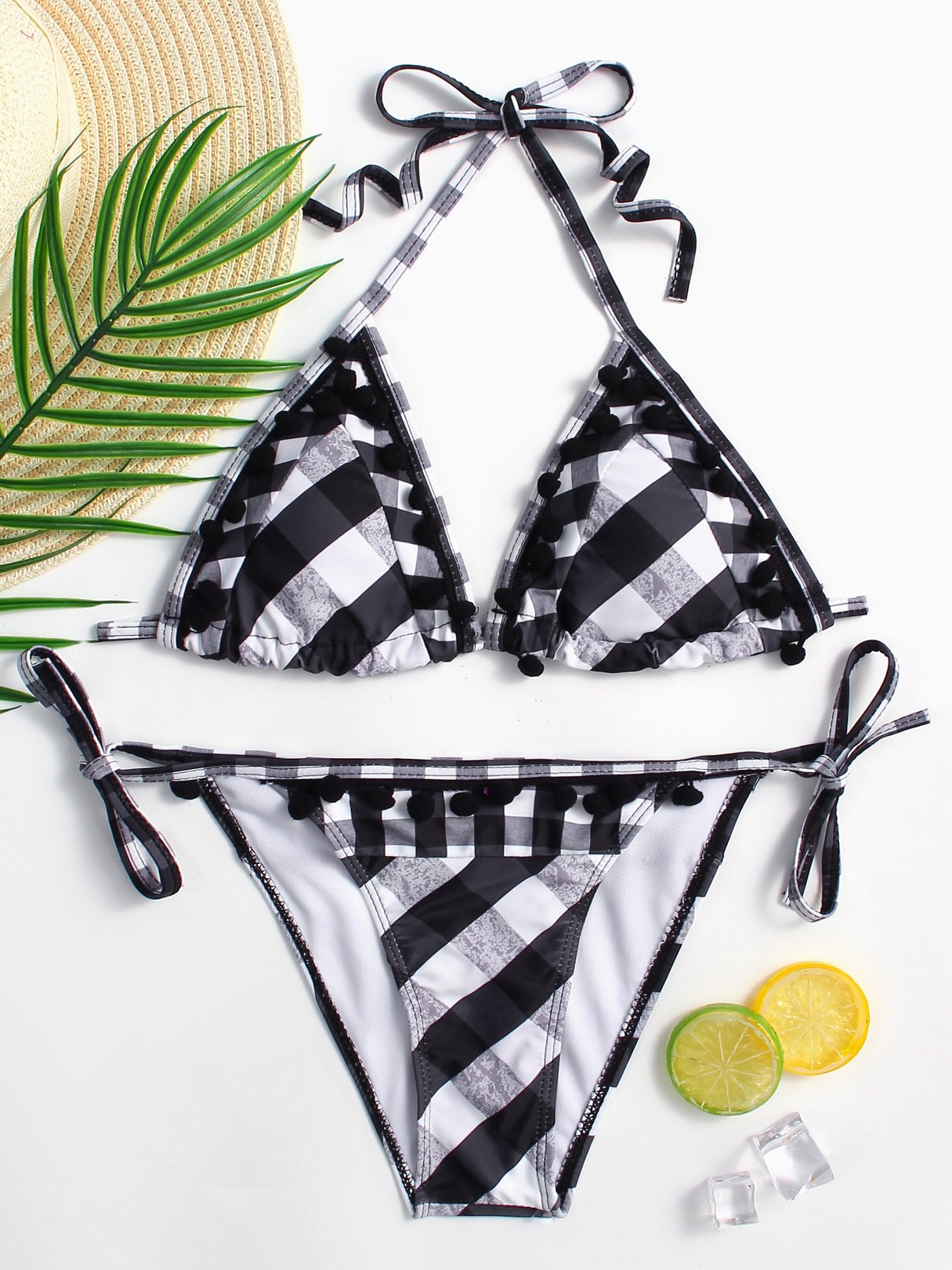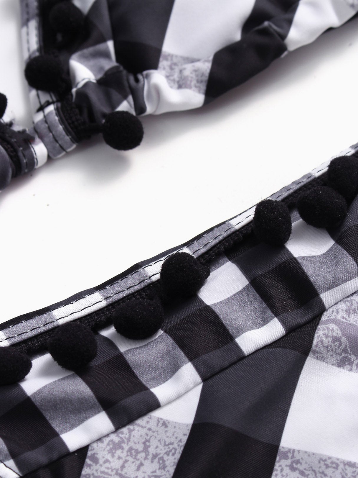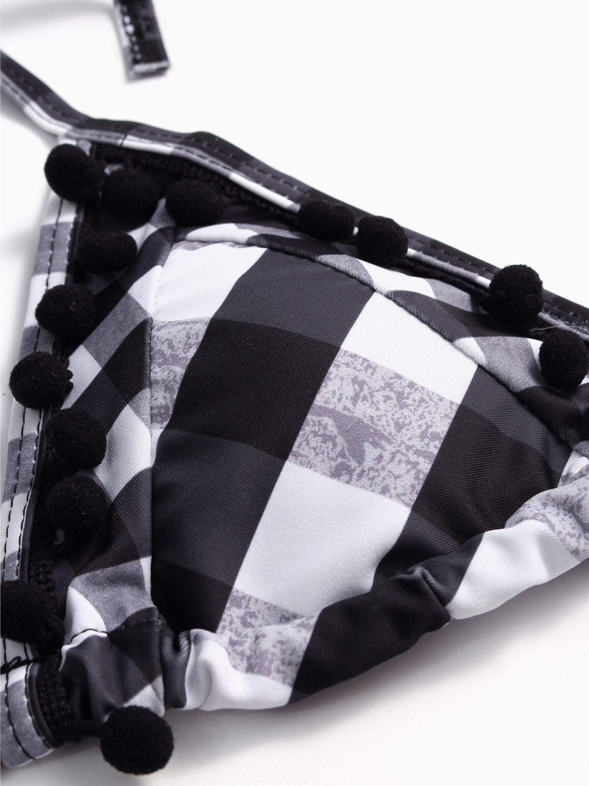 Halter Sleeveless Grid Backless Lace-Up Tassel Hem Two Piece Bikinis