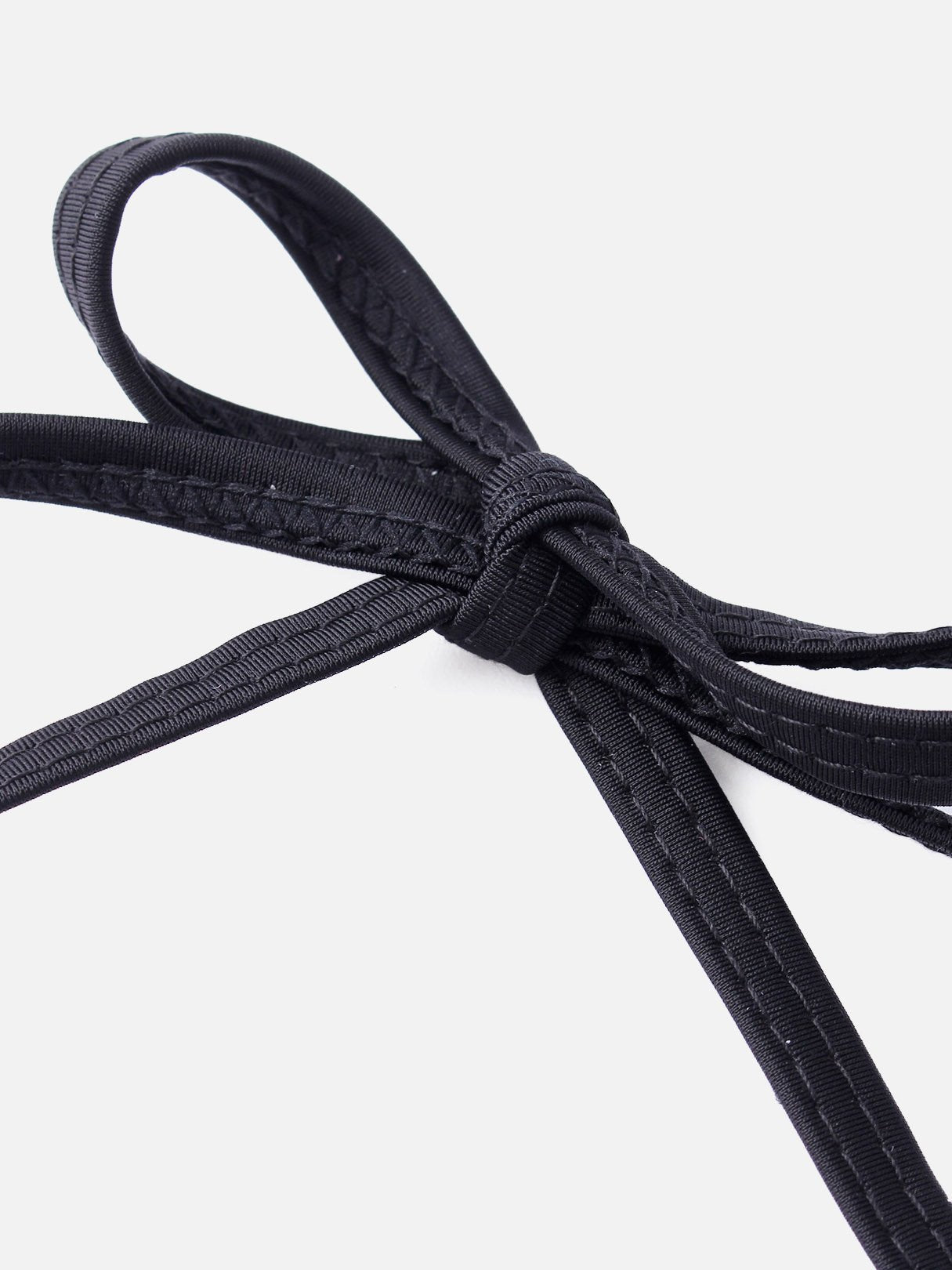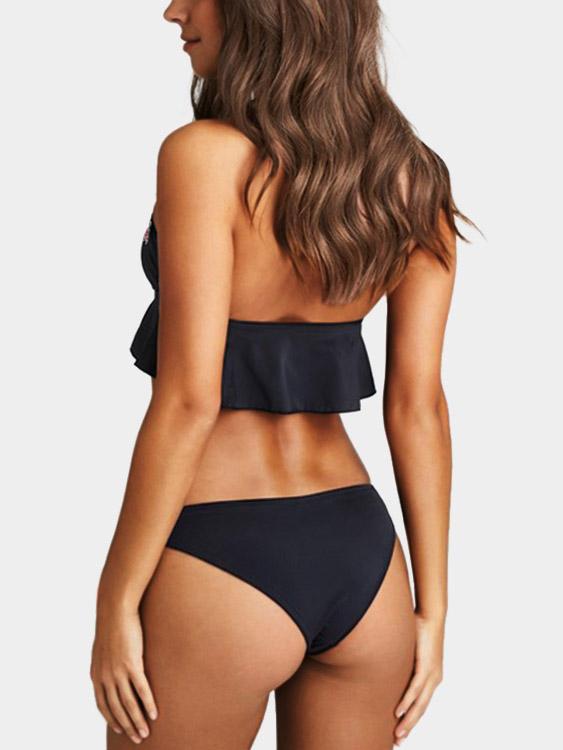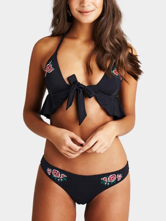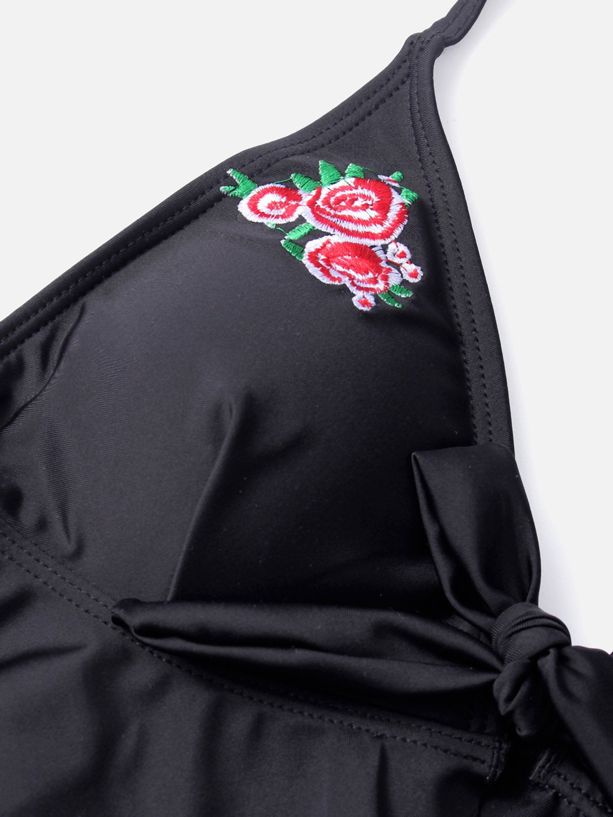 Halter V-Neck Embroidered Lace-Up Wireless Sleeveless Black Bikinis