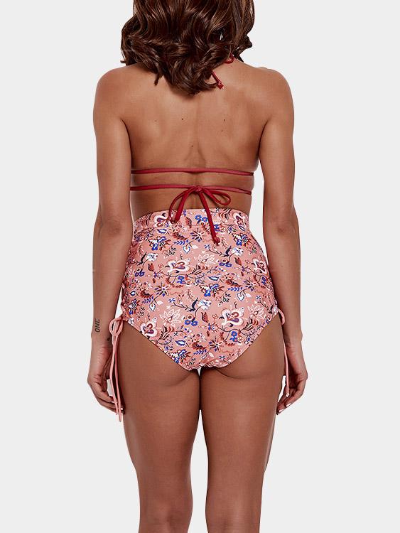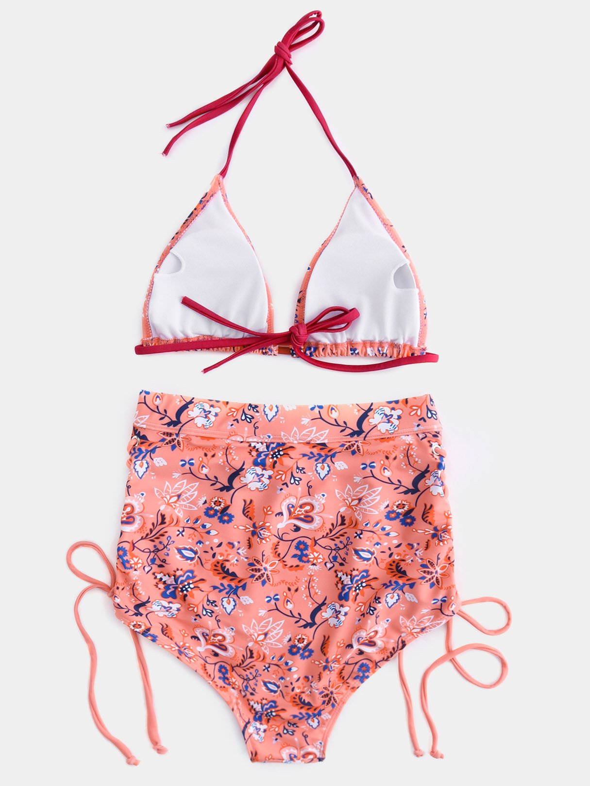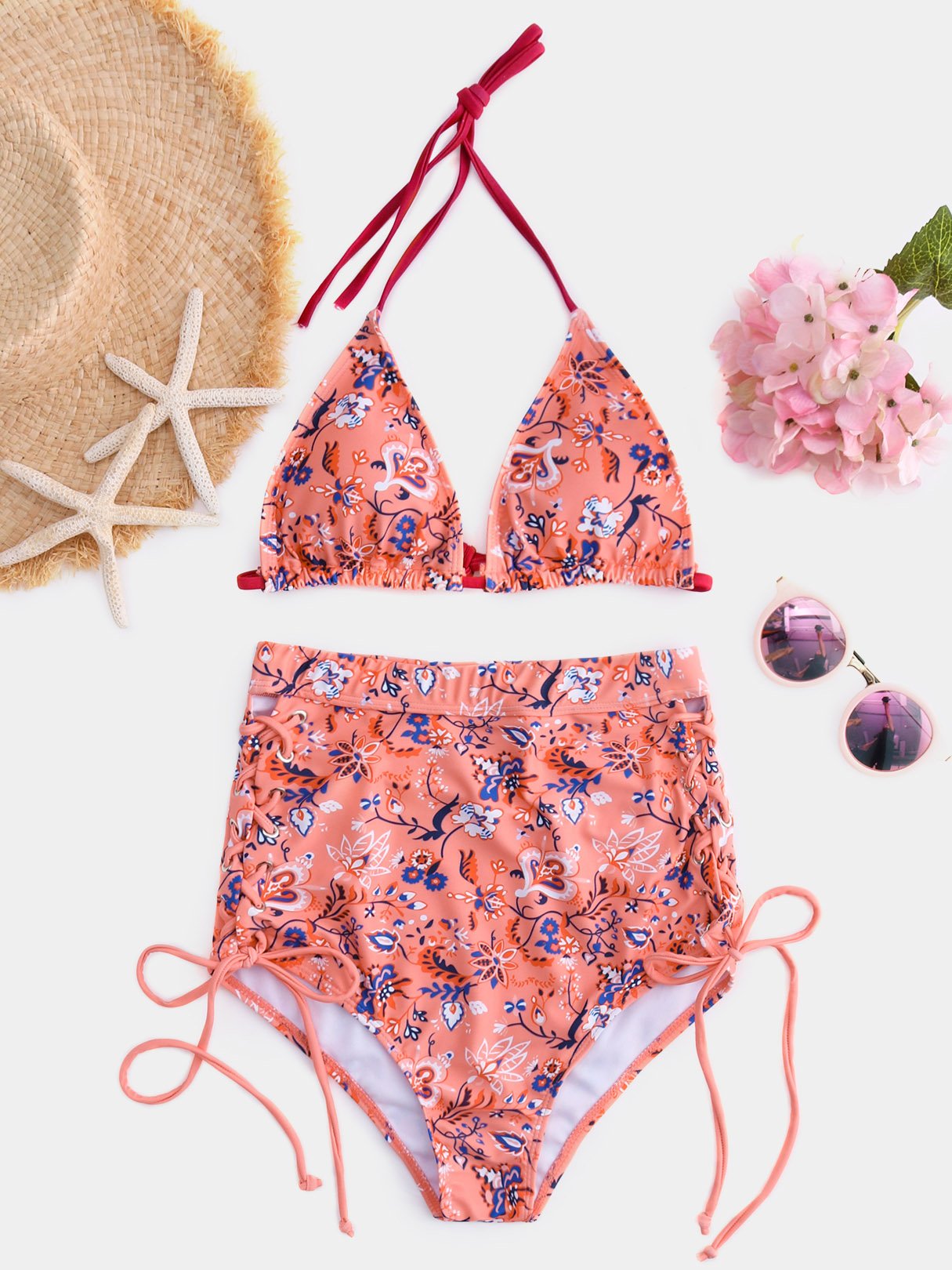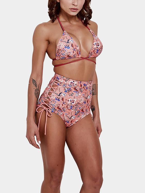 Halter V-Neck Floral Print Criss-Cross Tie-Up Sleeveless High-Waisted Pink Bikini Set