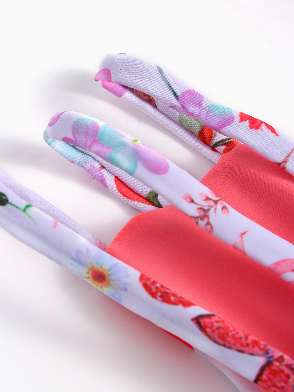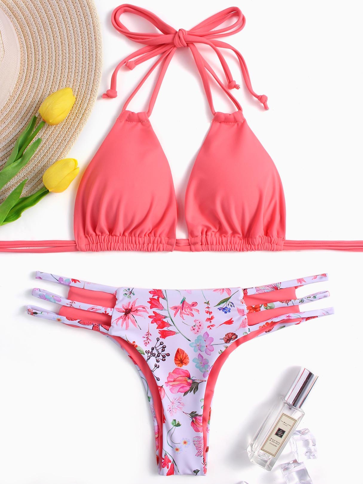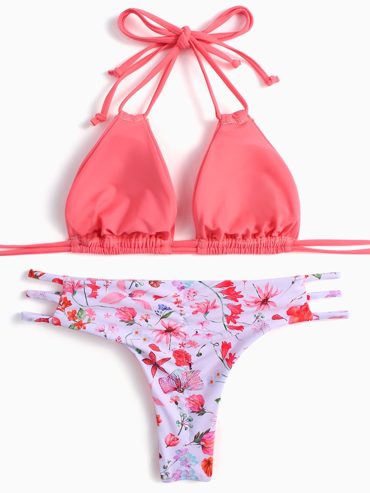 Halter V-Neck Floral Print Cut Out Tie-Up Sleeveless Pink Bikinis