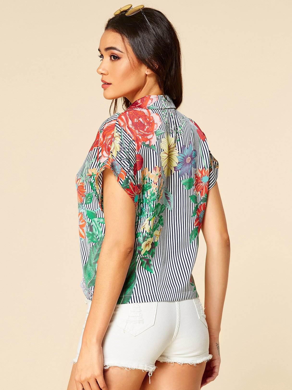 Lapel Collar Stripe Floral Print Short Sleeve Blouses