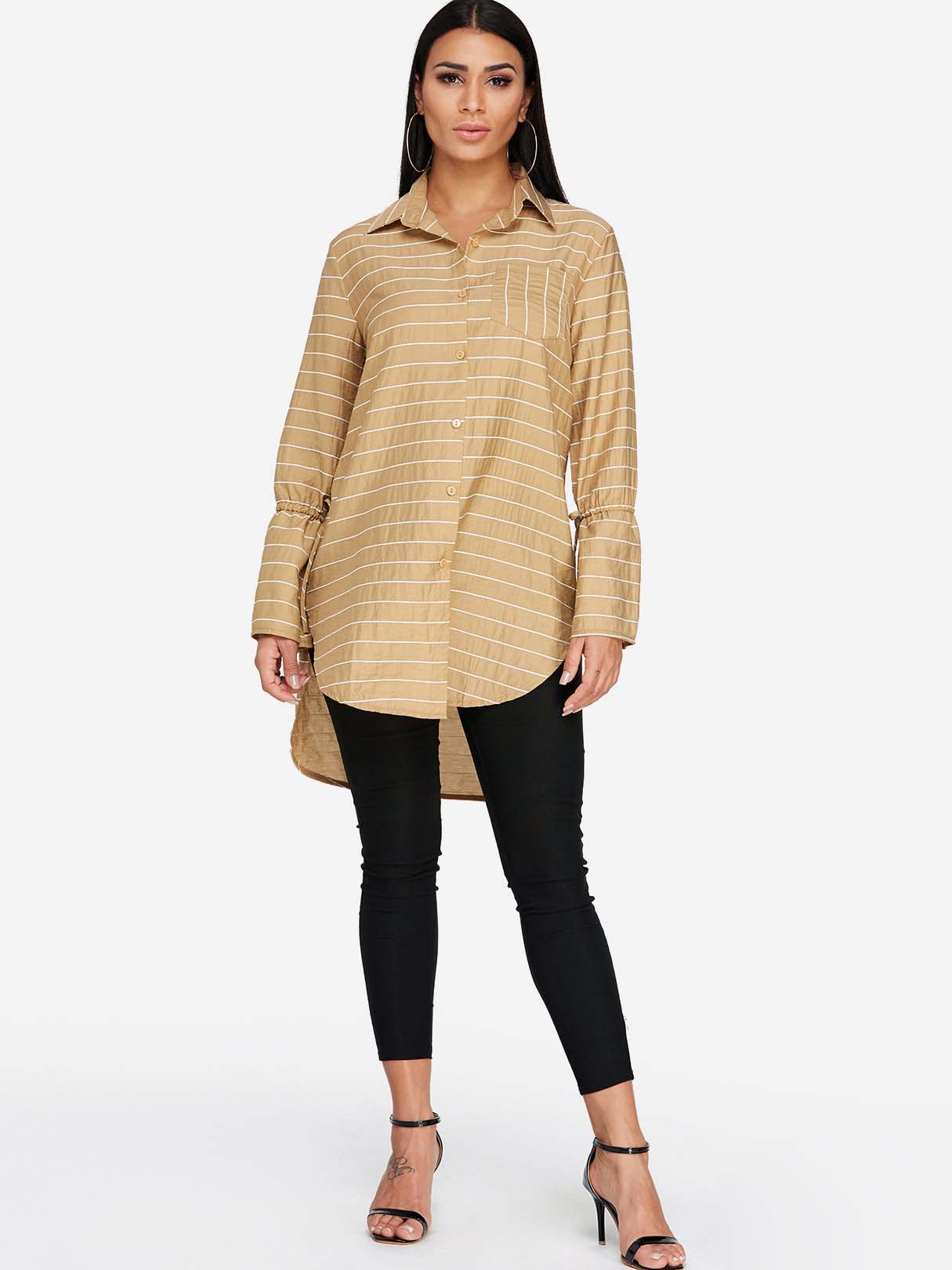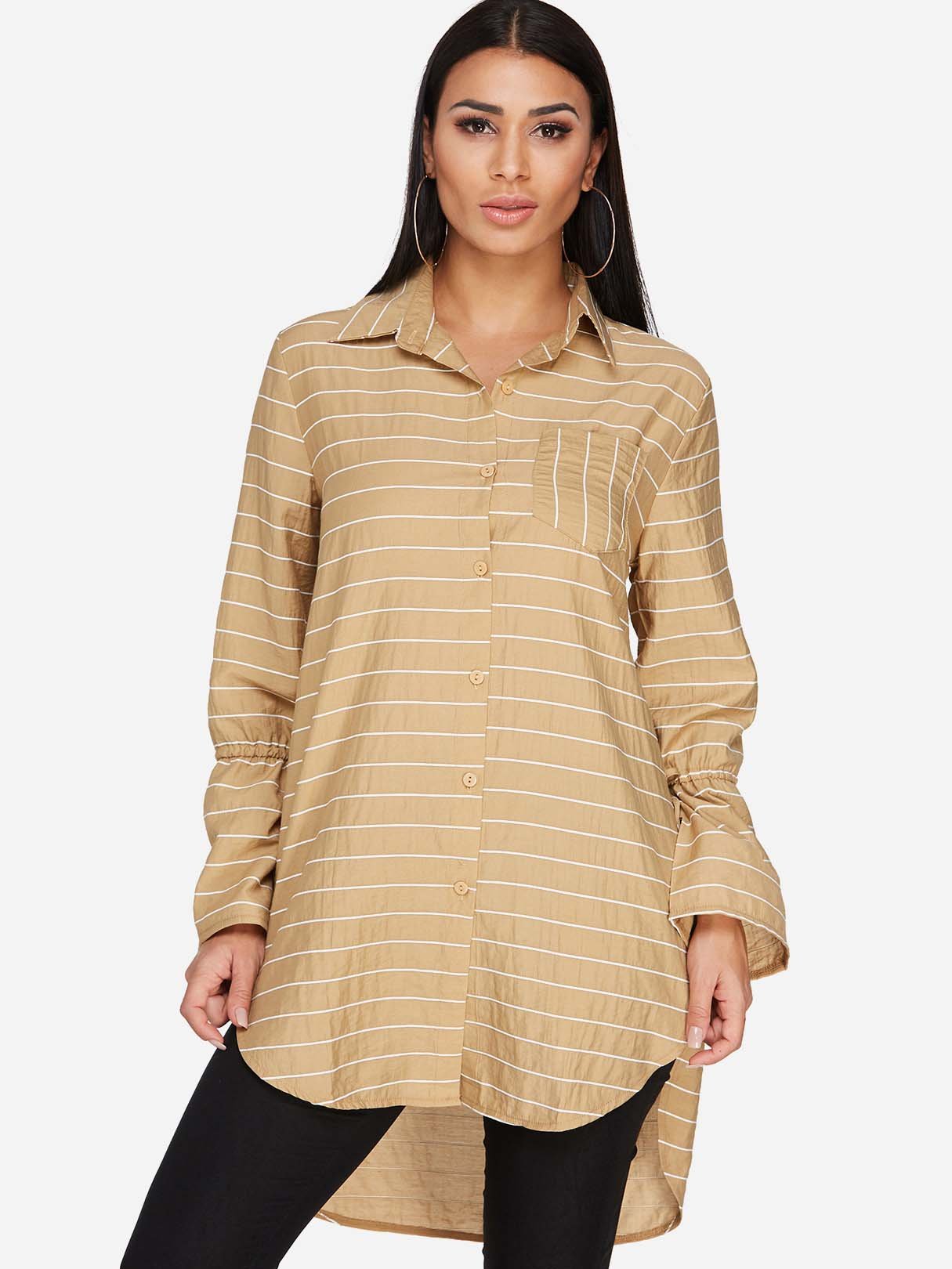 Lapel Collar Stripe Long Sleeve Irregular Hem Khaki Blouses