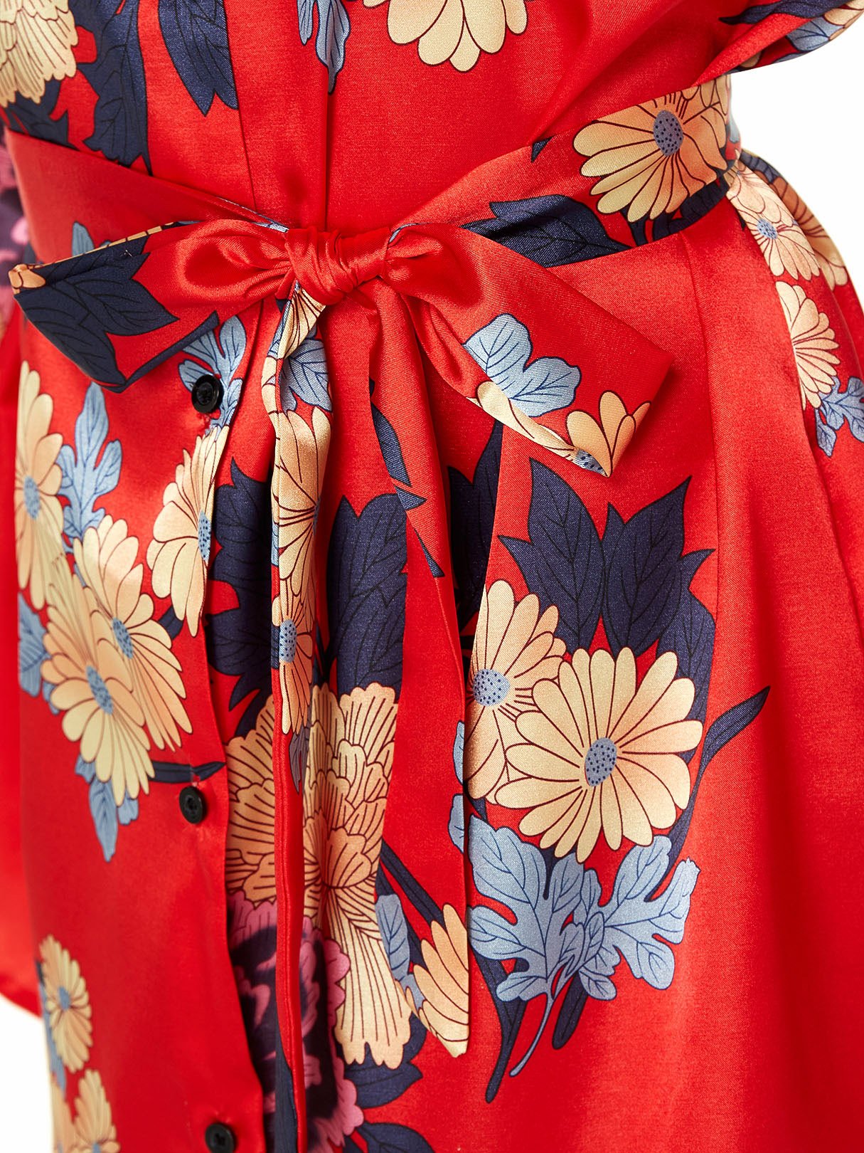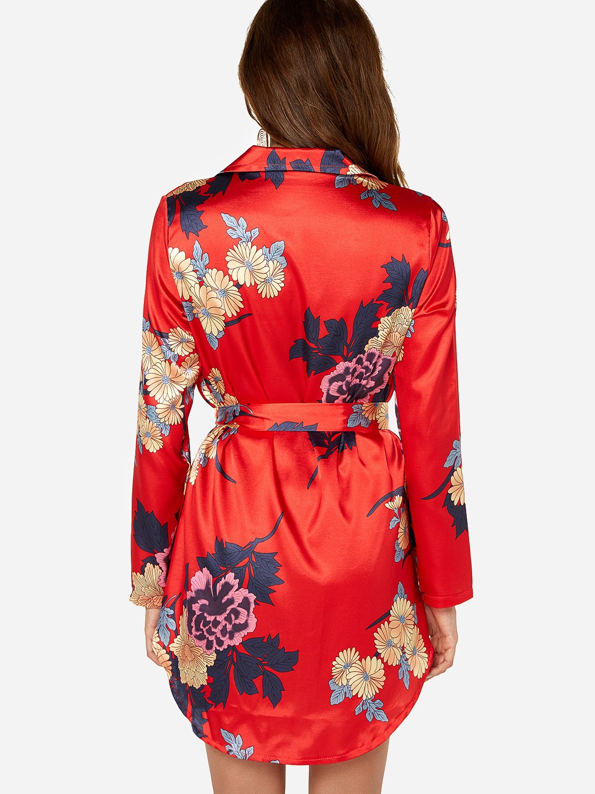 Long Sleeve Floral Print Belt Self-Tie Curved Hem Mini Dress - Red / S is backordered and will ship as soon as it is back in stock.