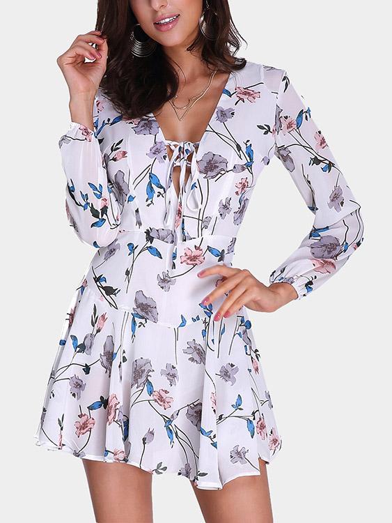 Long Sleeve Floral Print Lace-up Front Mini Dress With Zip Back - Multi / S is backordered and will ship as soon as it is back in stock.