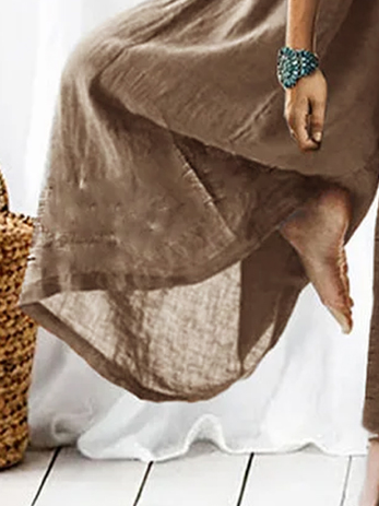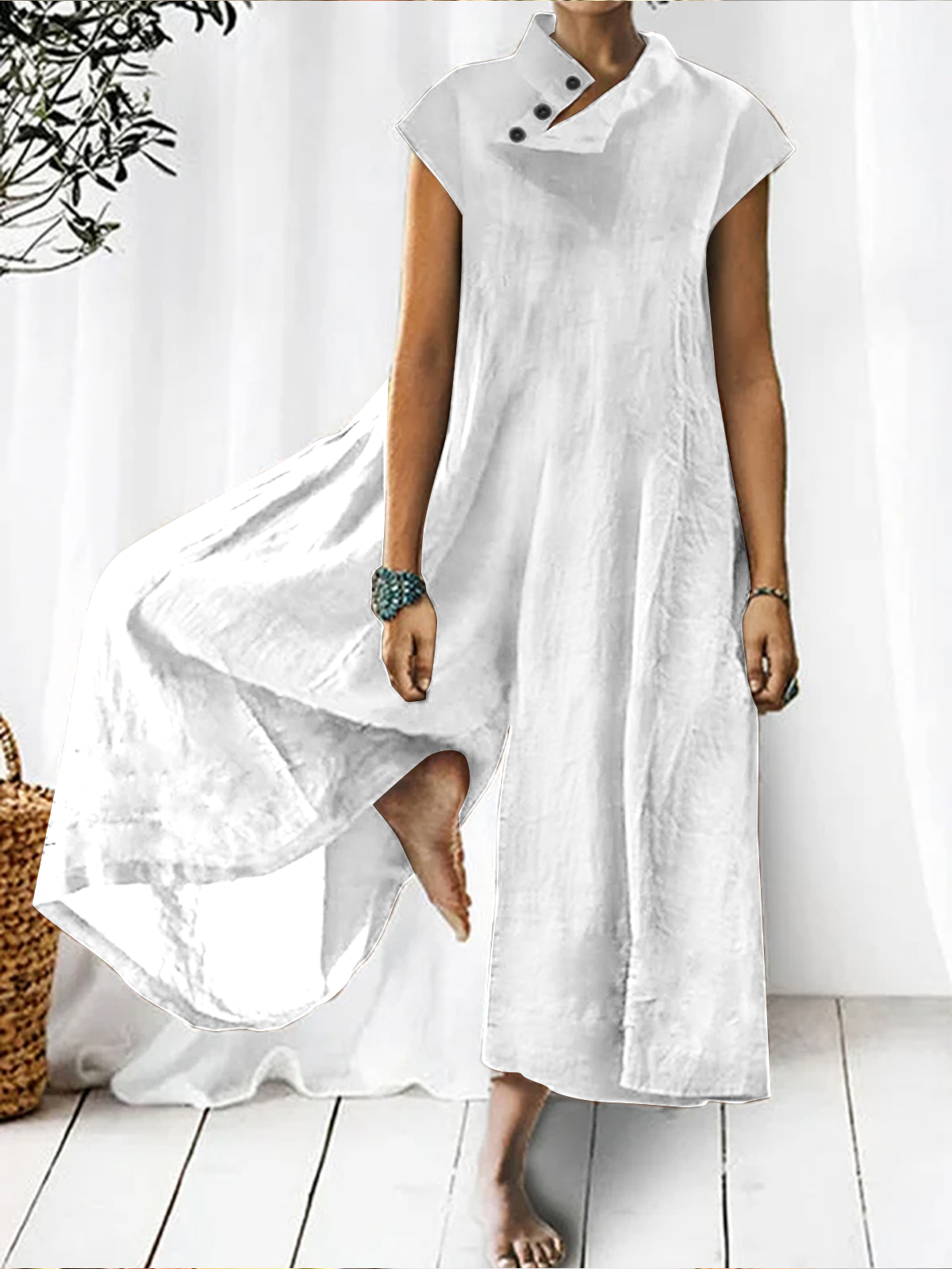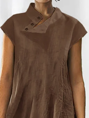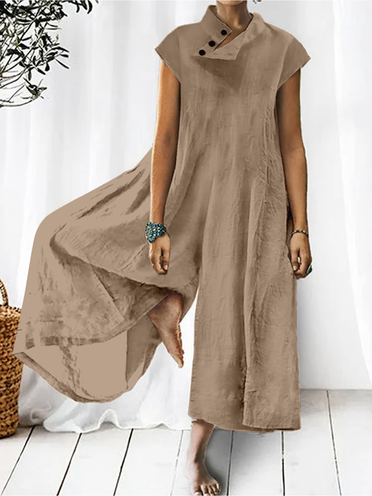 Loose Cap Sleeve Half Open Collar Plain Linen Jumpsuit - Brown / S is backordered and will ship as soon as it is back in stock.