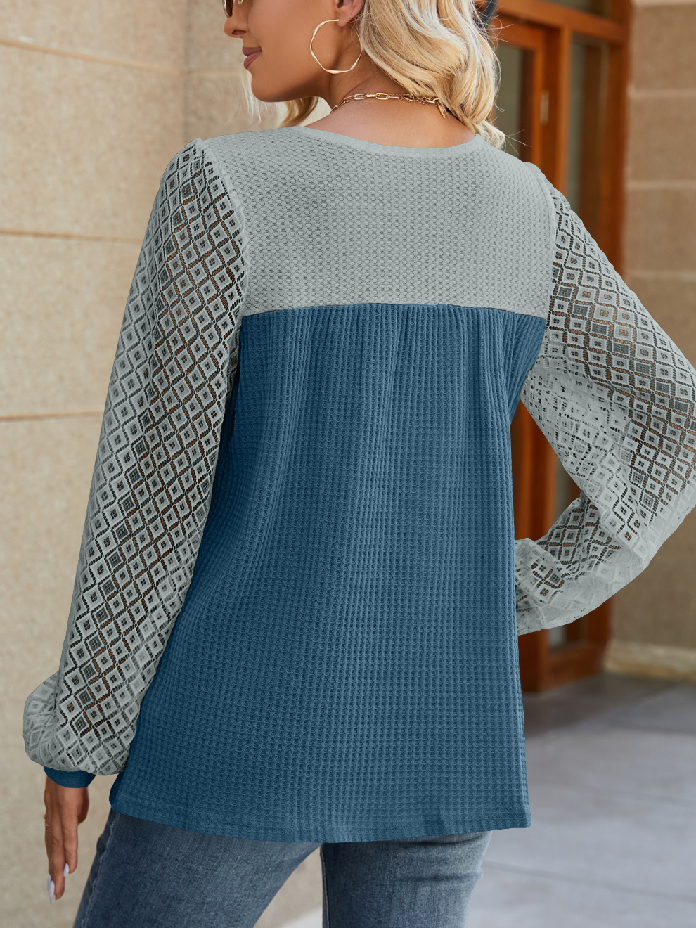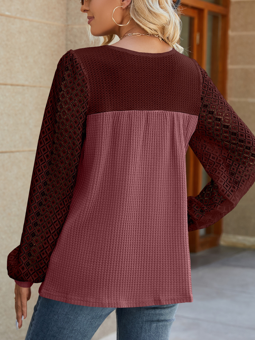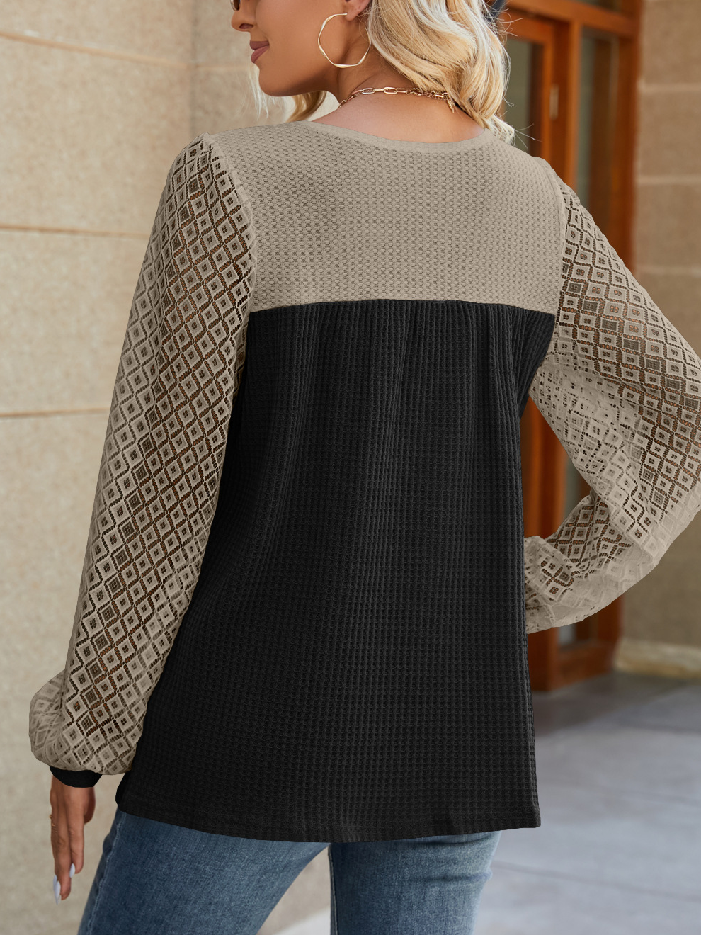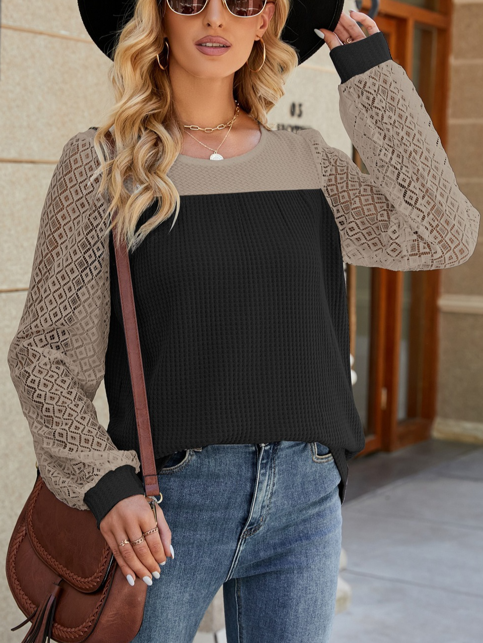 Loose Crew Neck Long Sleeve Color Block Fashion Regular Blouses