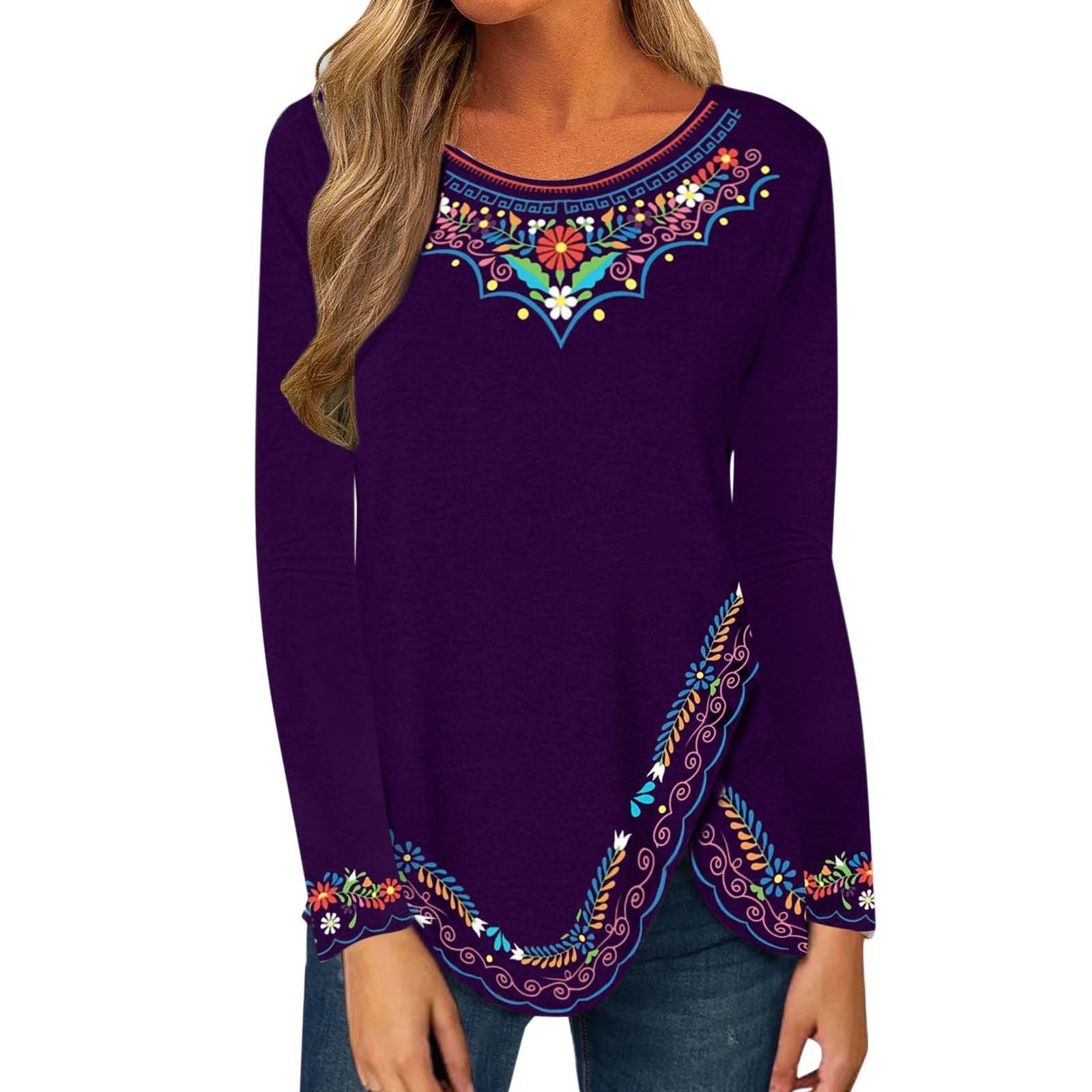 Loose Crew Neck Long Sleeve Ethnic Fashion Mid-Long Blouses