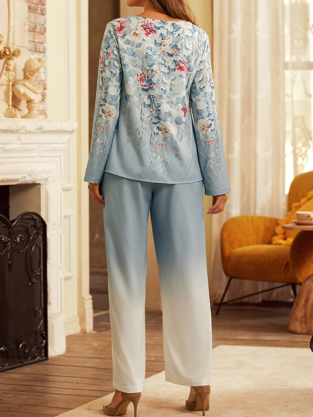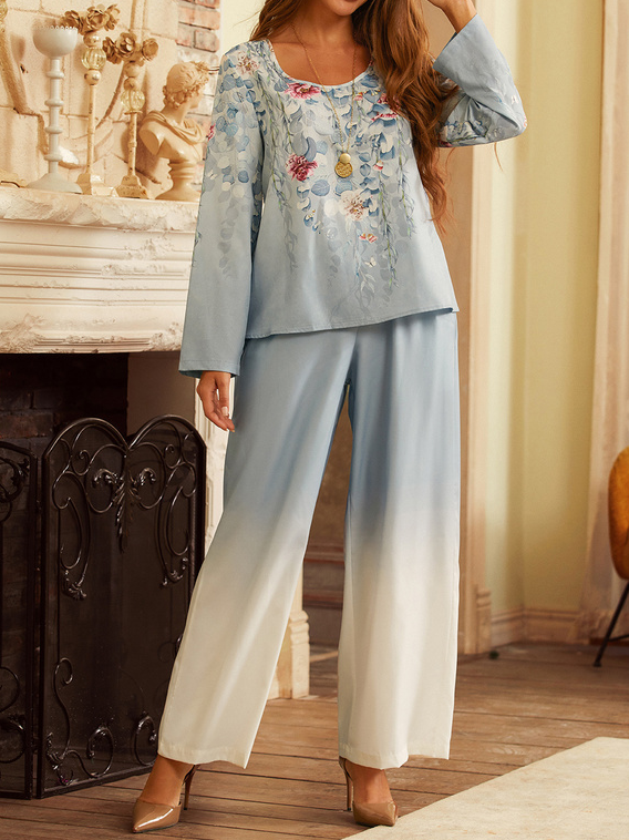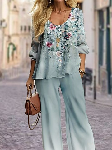 Loose Crew Neck Long Sleeve Floral Fashion Two-Piece Set - Green / S is backordered and will ship as soon as it is back in stock.
