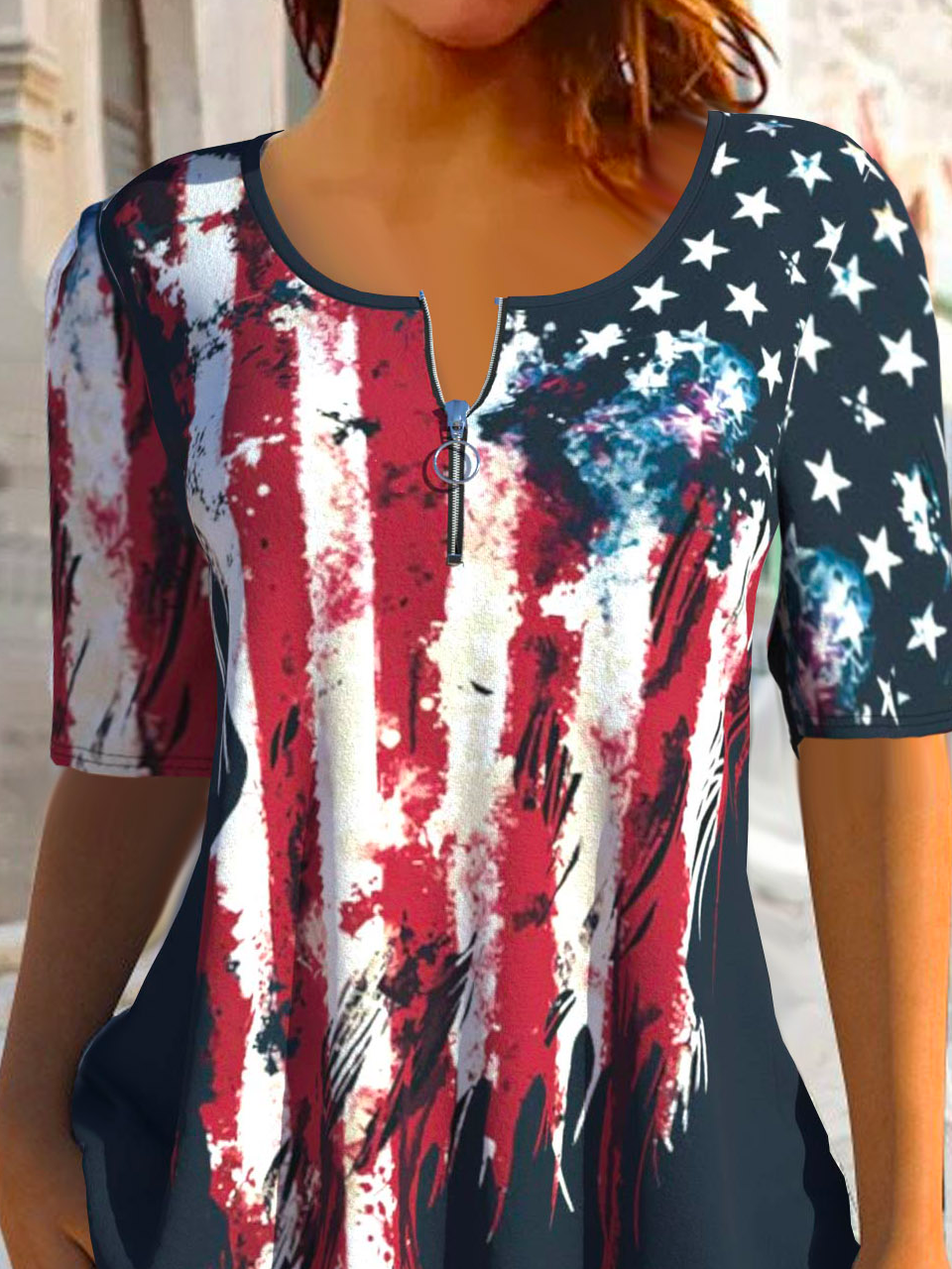 Loose Short Sleeve Crew Neck America Flag Zipper Fashion Mid-Long Blouses - Multicolor / S is backordered and will ship as soon as it is back in stock.