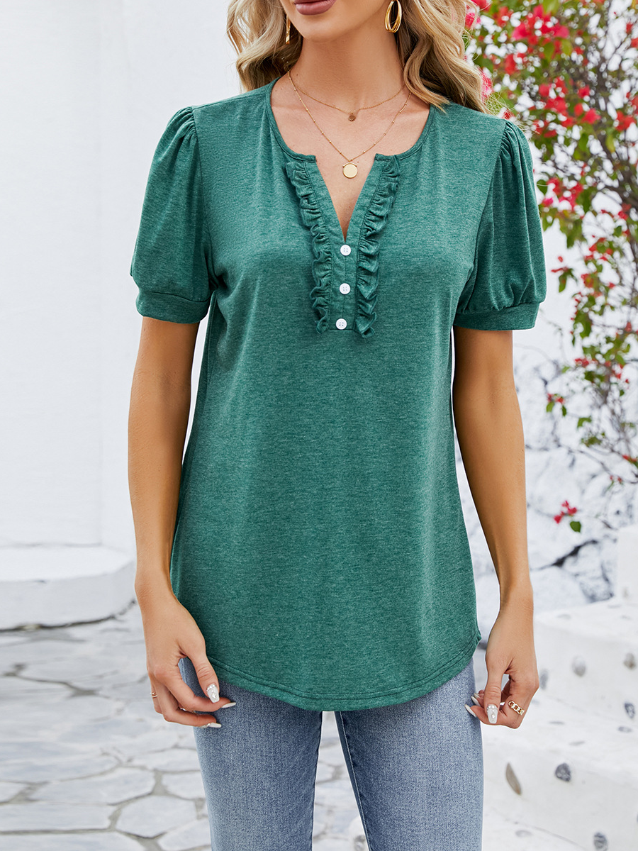 Loose Short Sleeve Notched Plain Fashion Regular Blouse