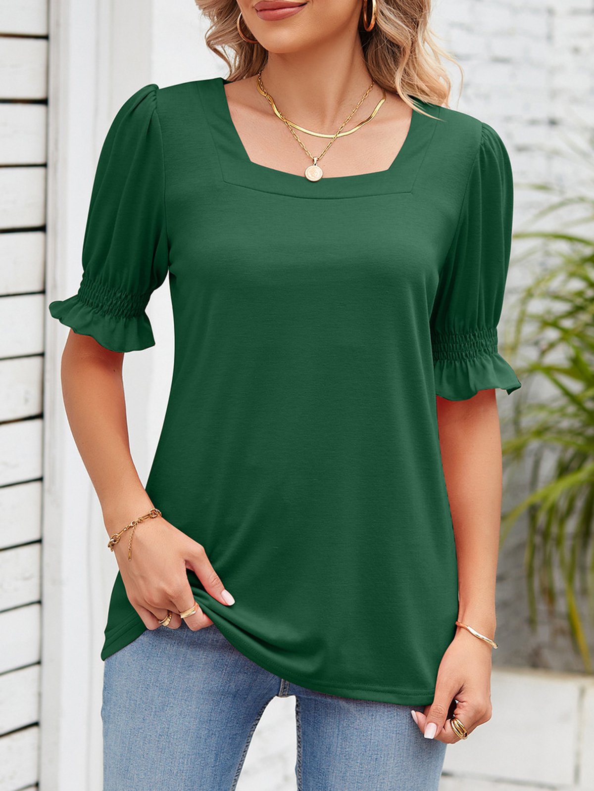 Loose Short Sleeve Square Neck Plain Fashion Regular Blouse