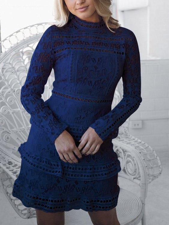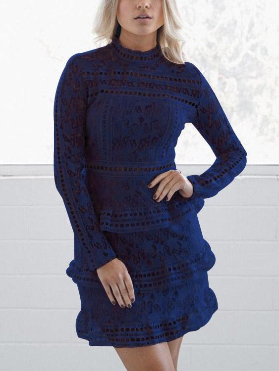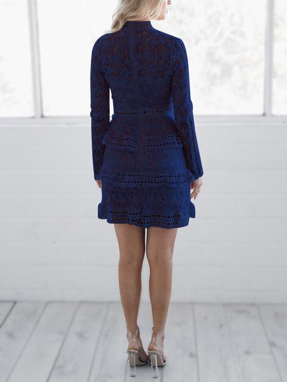 Navy Crew Neck Long Sleeve Lace Zip Back Hollow Ruffle Hem Sexy Dresses