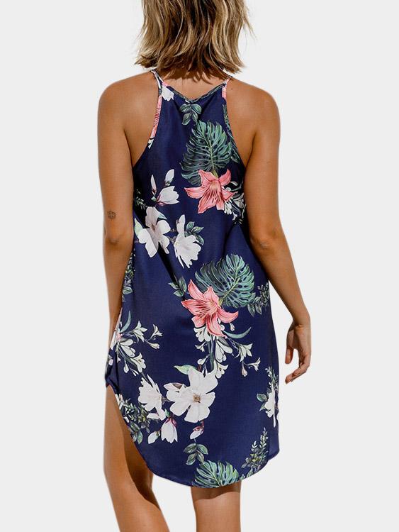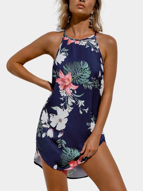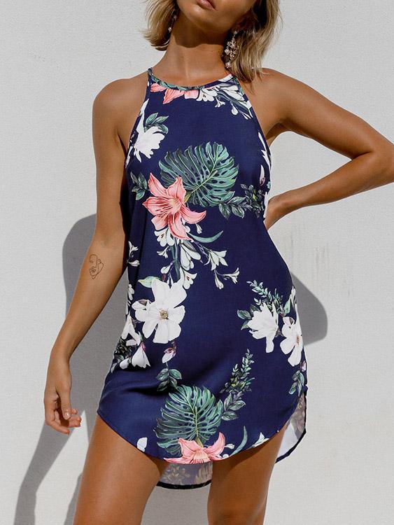 Material:Polyester,SpandexNeckline:Crew NeckSeason:Spring,Summer,AutumnSleeves:SleevelessPattern:Floral PrintStyle:Vacation StyleHem Design:Curved HemLength:MiniFit:Regular Fit