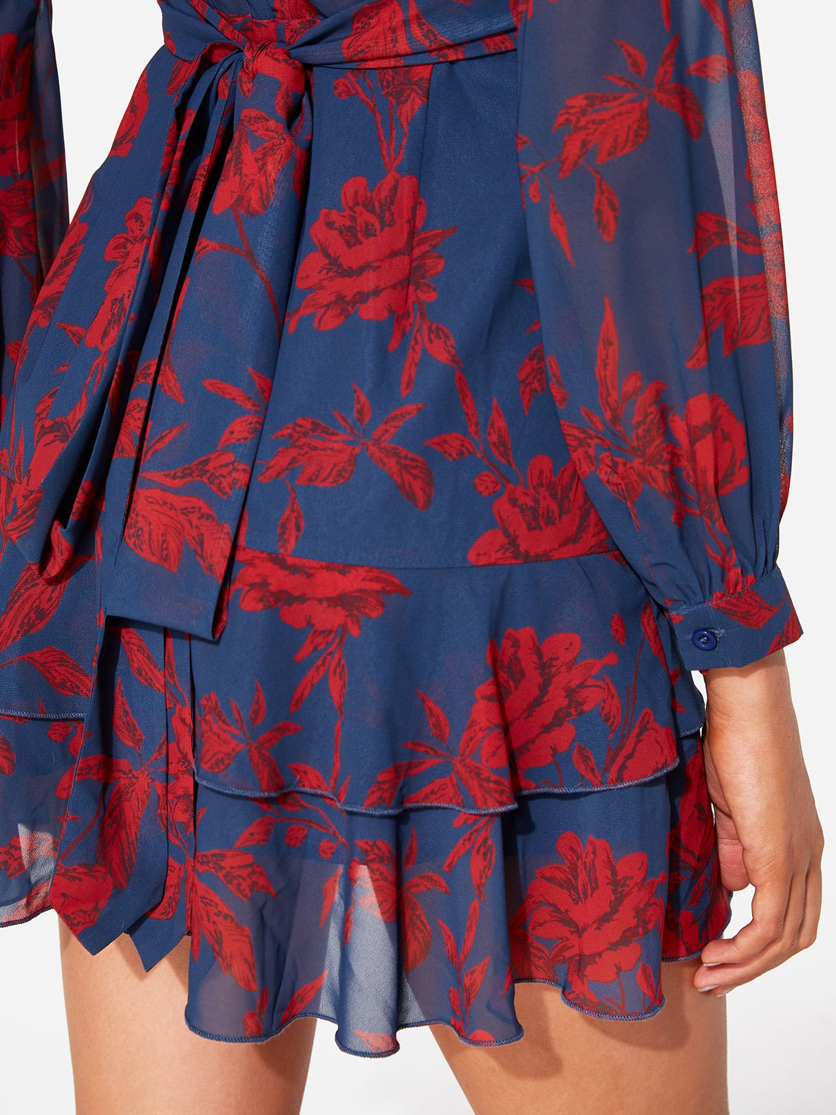 Navy Deep V Neck Long Sleeve Floral Print See Through Self-Tie Wrap Flounced Hem Dresses