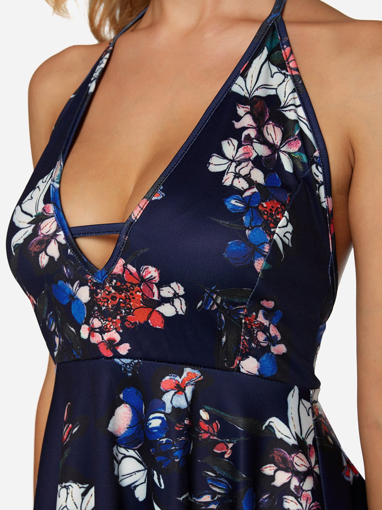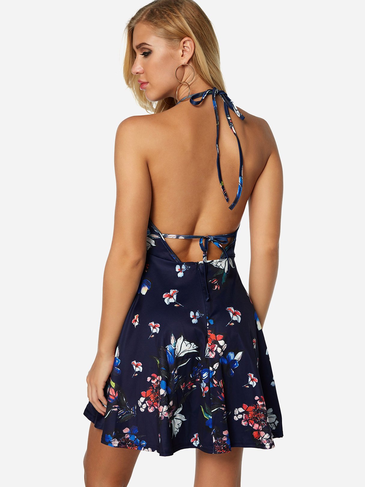 Material:PolyesterNeckline:Deep V NeckSeason:Spring,Summer,AutumnSleeves:SleevelessPattern:Floral PrintStyle:Sexy StyleDetail:Elastic Strap Back Detail,Adjustable Neck Strap,Backless Design,Lace-Up Design,Cut OutWaist Design:High-WaistedHem Design:Ruffle HemLength:MiniFit:Regular Fit
