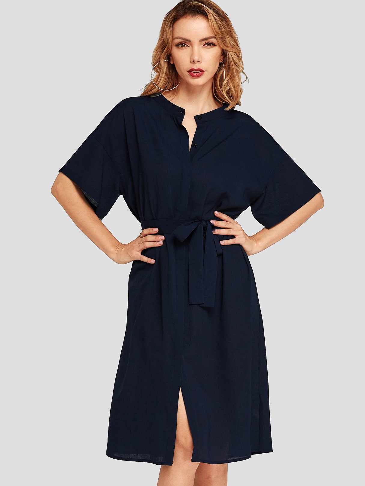 Navy Half Sleeve Self-Tie Midi Dresses