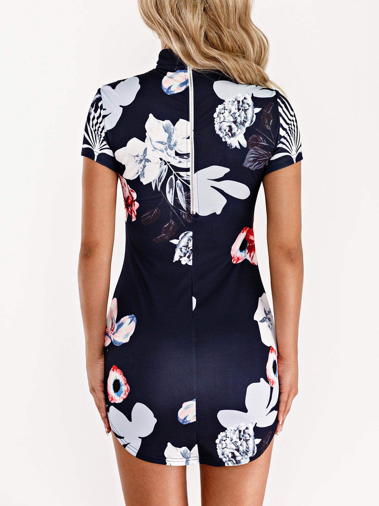 Material:Polyester,SpandexNeckline:Perkins CollarSeason:Spring,Summer,Autumn,WinterSleeves:Short SleevesPattern:Floral PrintStyle:Ladies Style,Casual StyleDetail:Zip Back DesignWaist Design:High-WaistedHem Design:Curved HemLength:MiniFit:Bodycon FitOccasion:Party