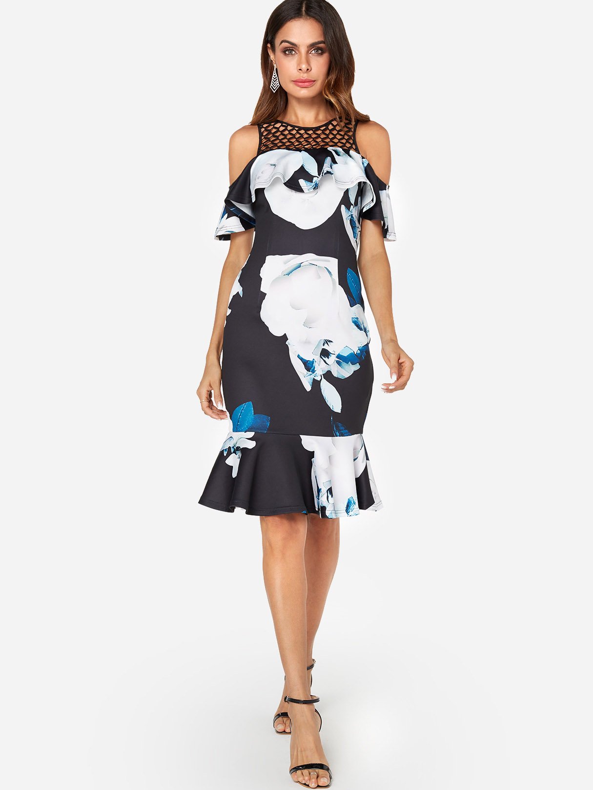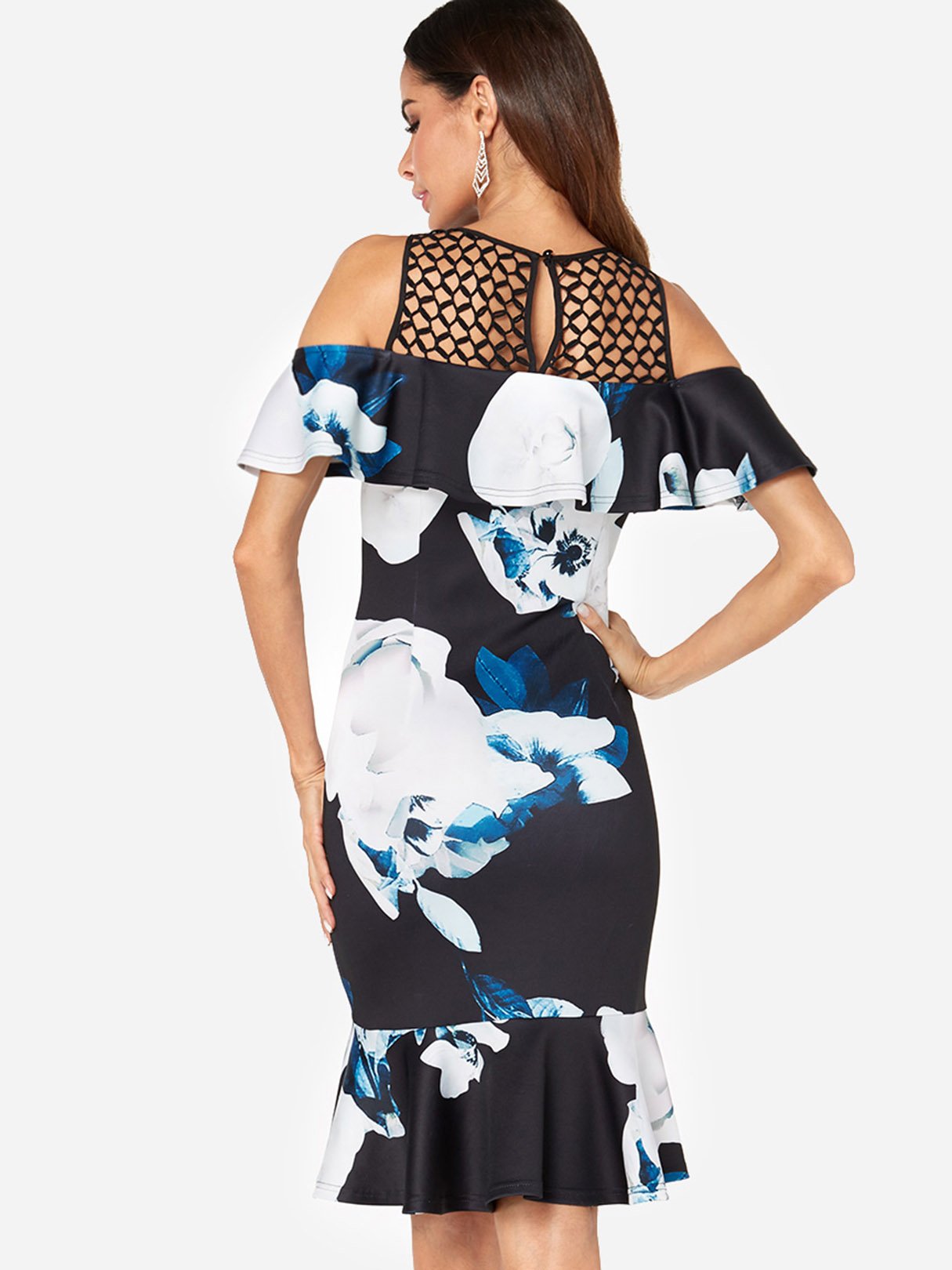 Navy Round Neck Cold Shoulder Floral Print Zip Back Cut Out Flounced Hem Dresses