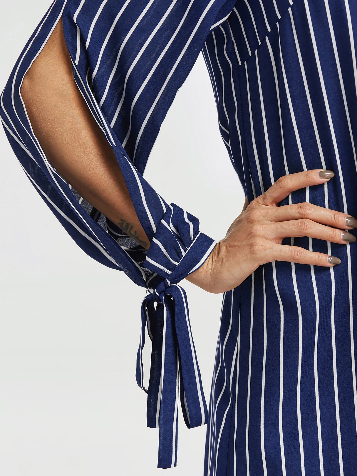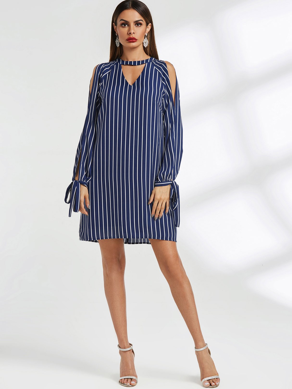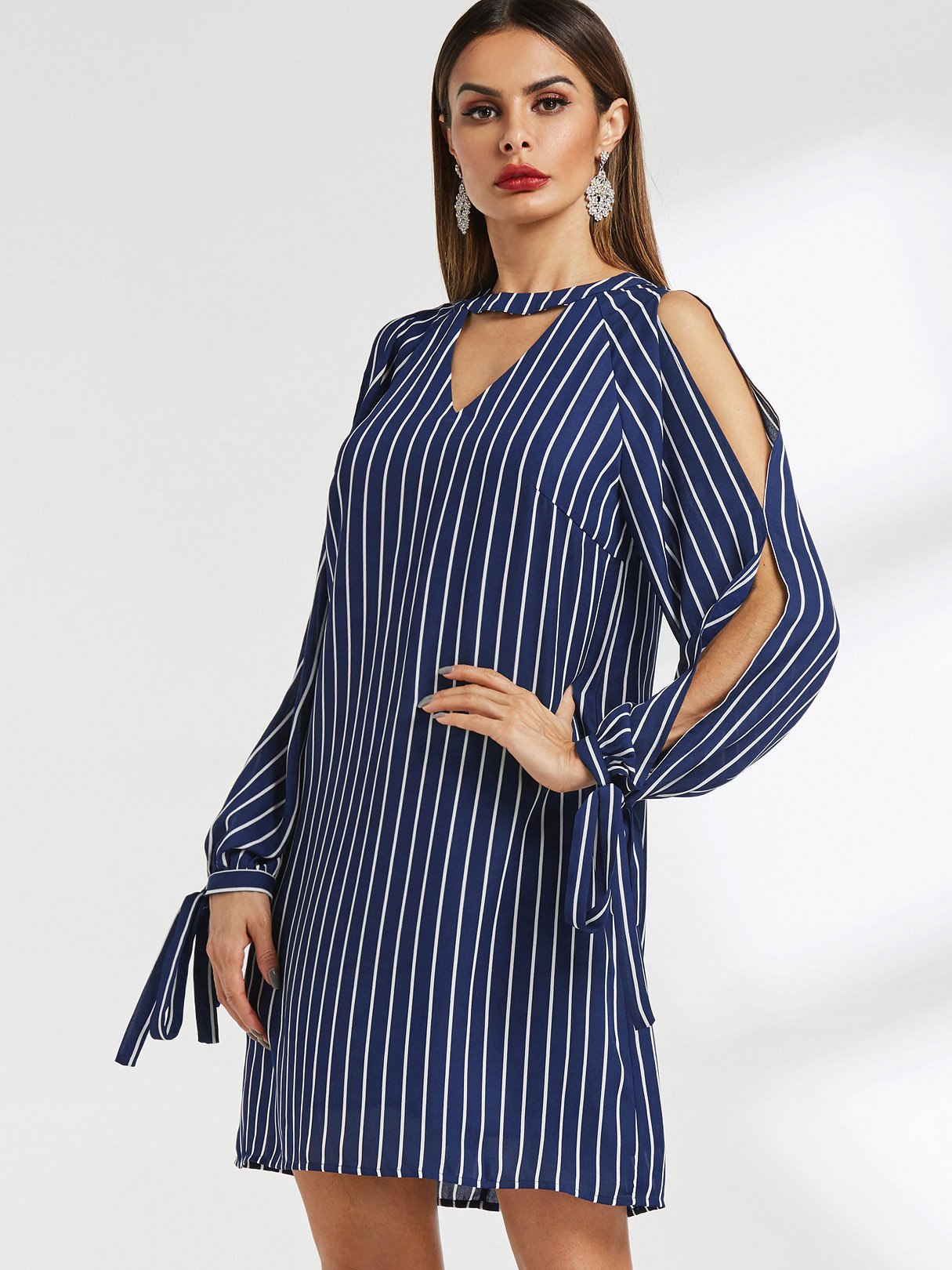 Navy Round Neck Long Sleeve Stripe Cut Out Self-Tie Mini Dress