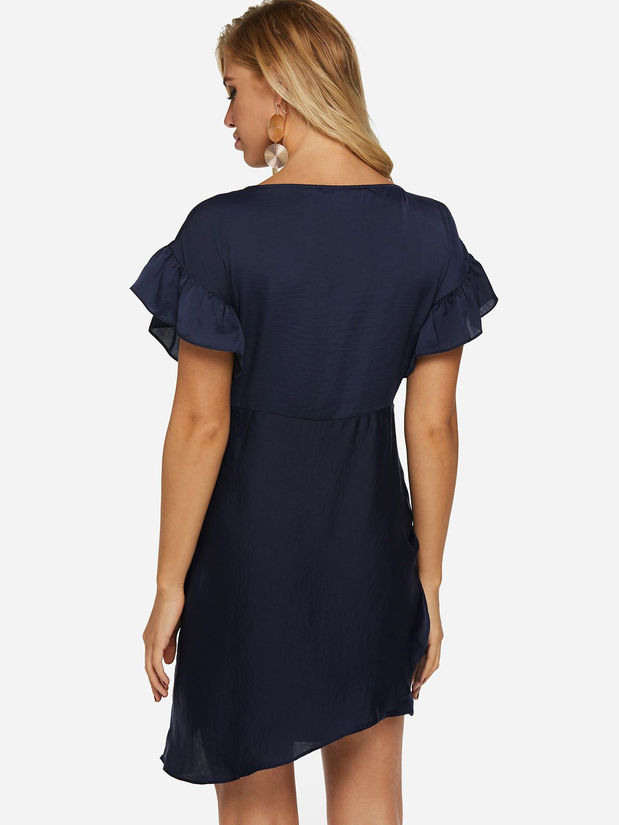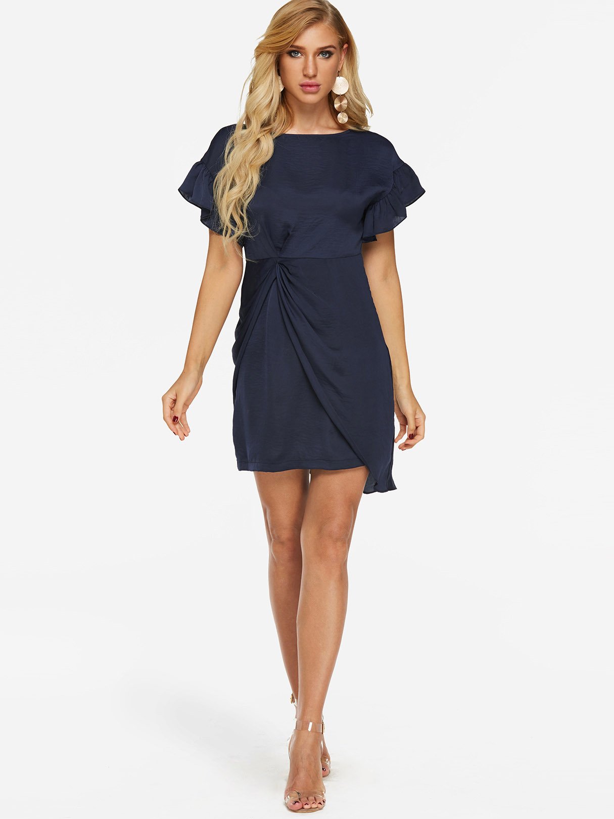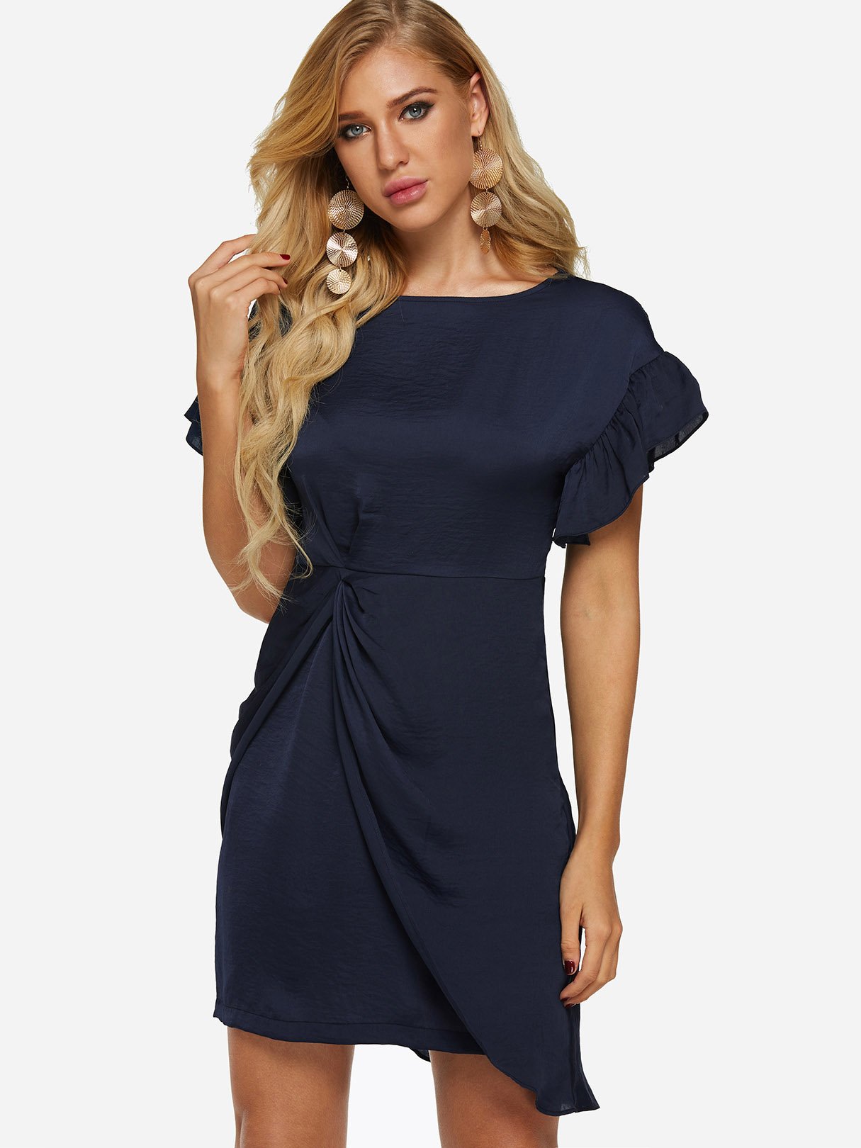 Navy Round Neck Short Sleeve Pleated Irregular Hem Sexy Dress