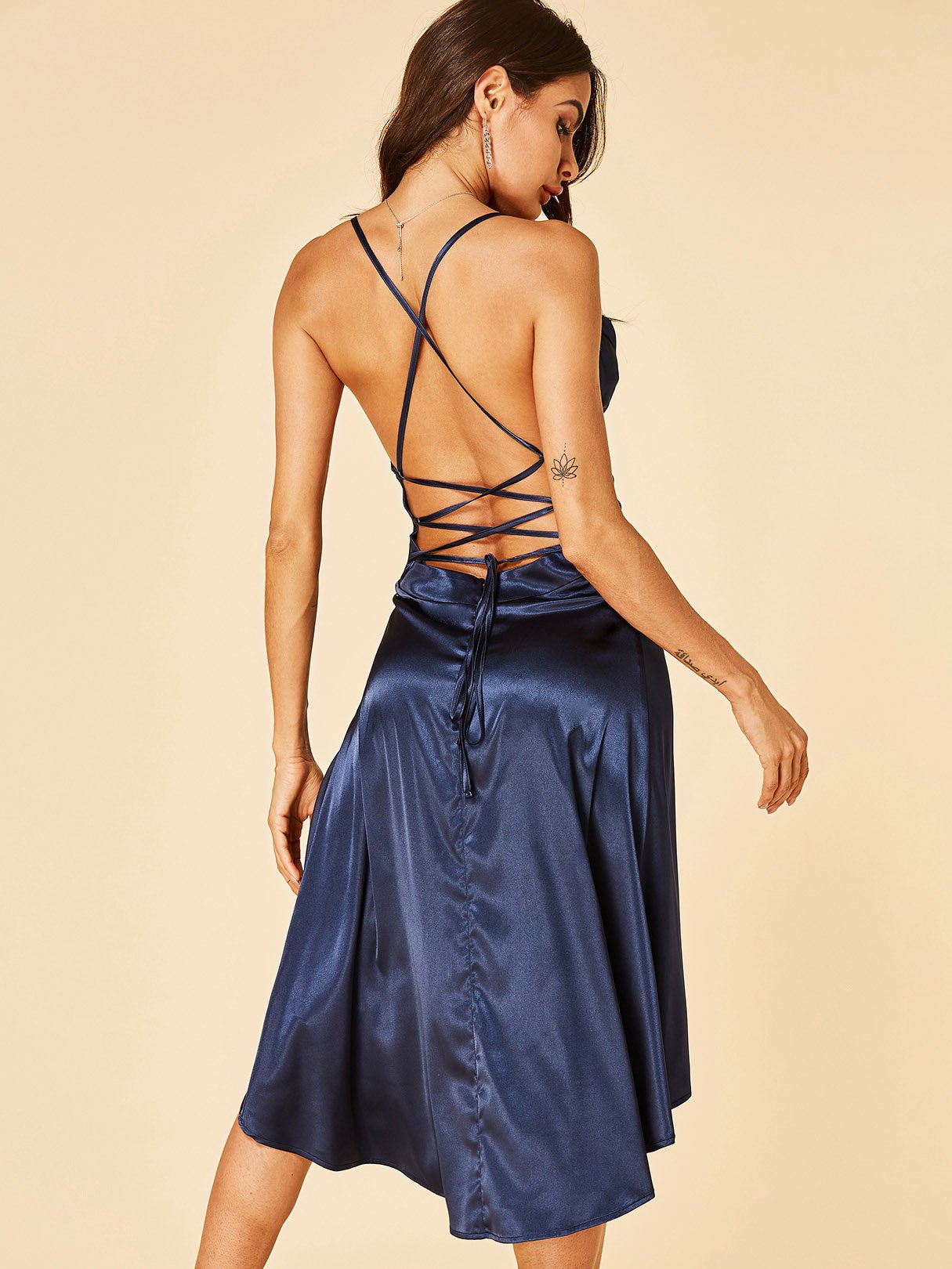 Navy Sleeveless Plain Backless Lace-Up High-Low Hem Sexy Dress