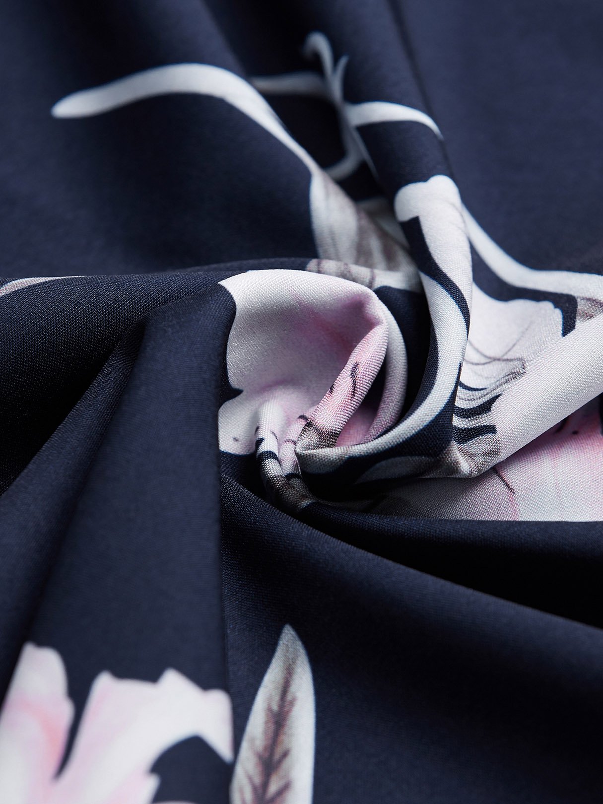 Navy V-Neck Half Sleeve Floral Print Slit Self-Tie Curved Hem Dresses