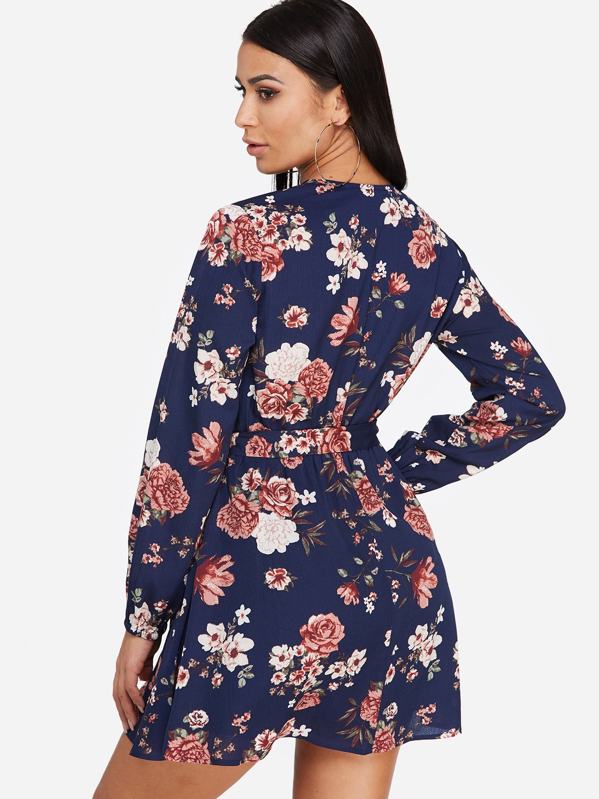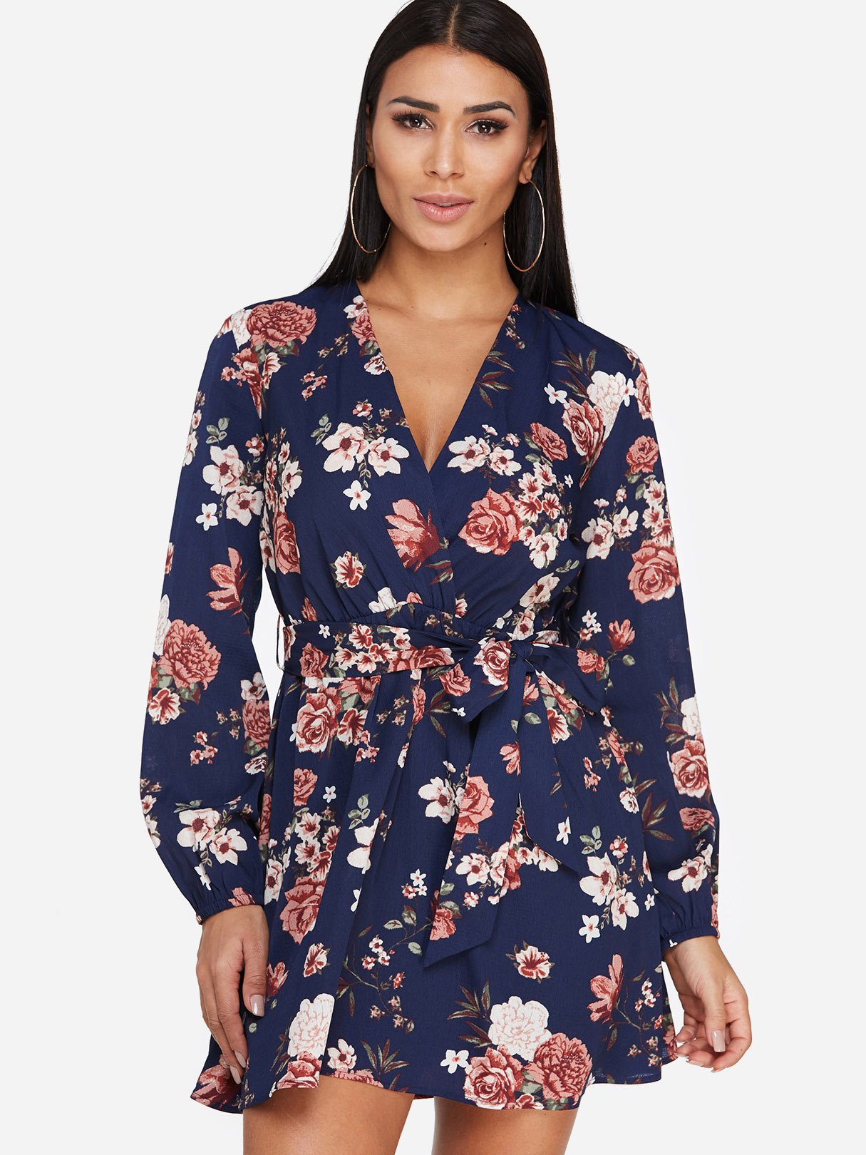 Material:PolyesterNeckline:V-NeckSeason:Autumn,WinterSleeves:Long SleevesPattern:Floral PrintStyle:Casual StyleDetail:Self-Tie DesignWaist Design:Drawstring WaistHem Design:Ruffle HemLength:MiniFit:Regular Fit