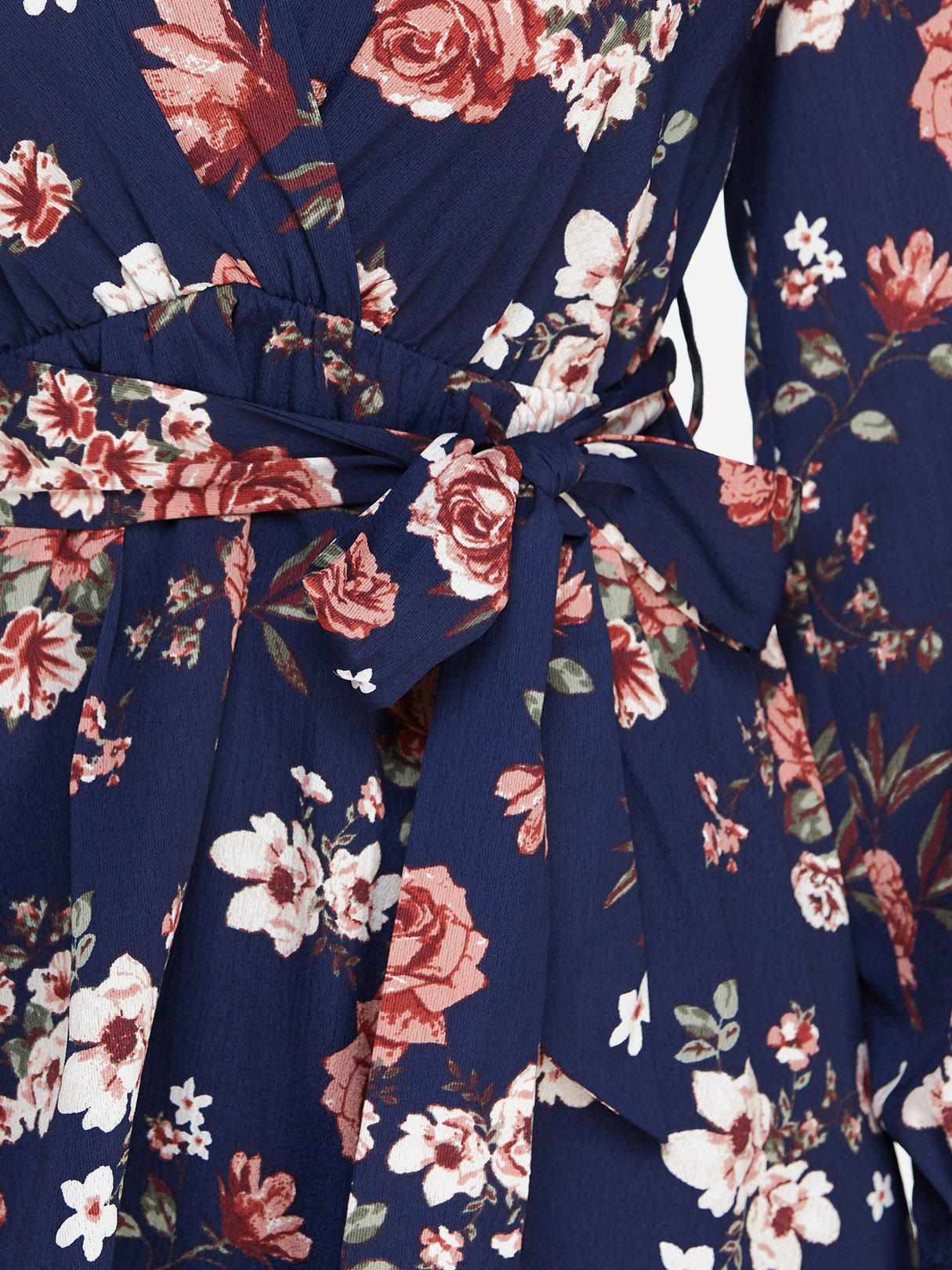 Navy V-Neck Long Sleeve Floral Print Self-Tie Ruffle Hem Mini Dress - Navy / S is backordered and will ship as soon as it is back in stock.