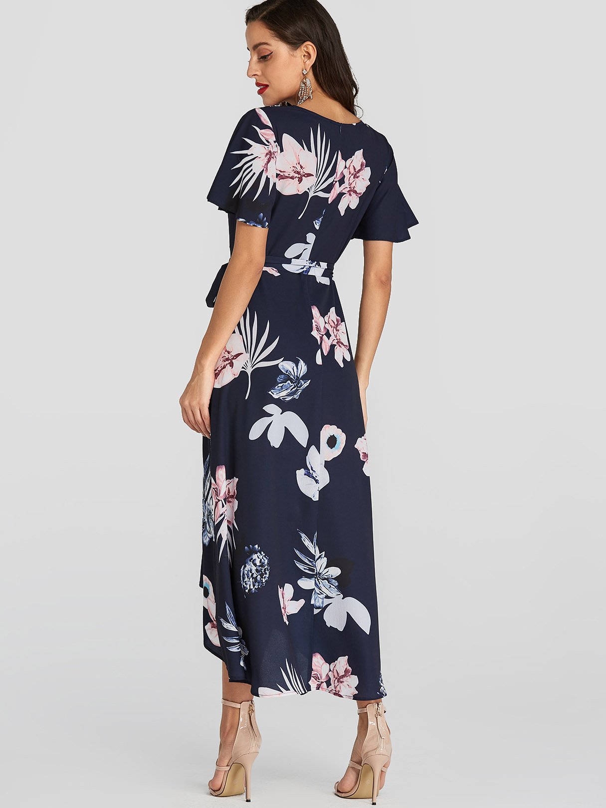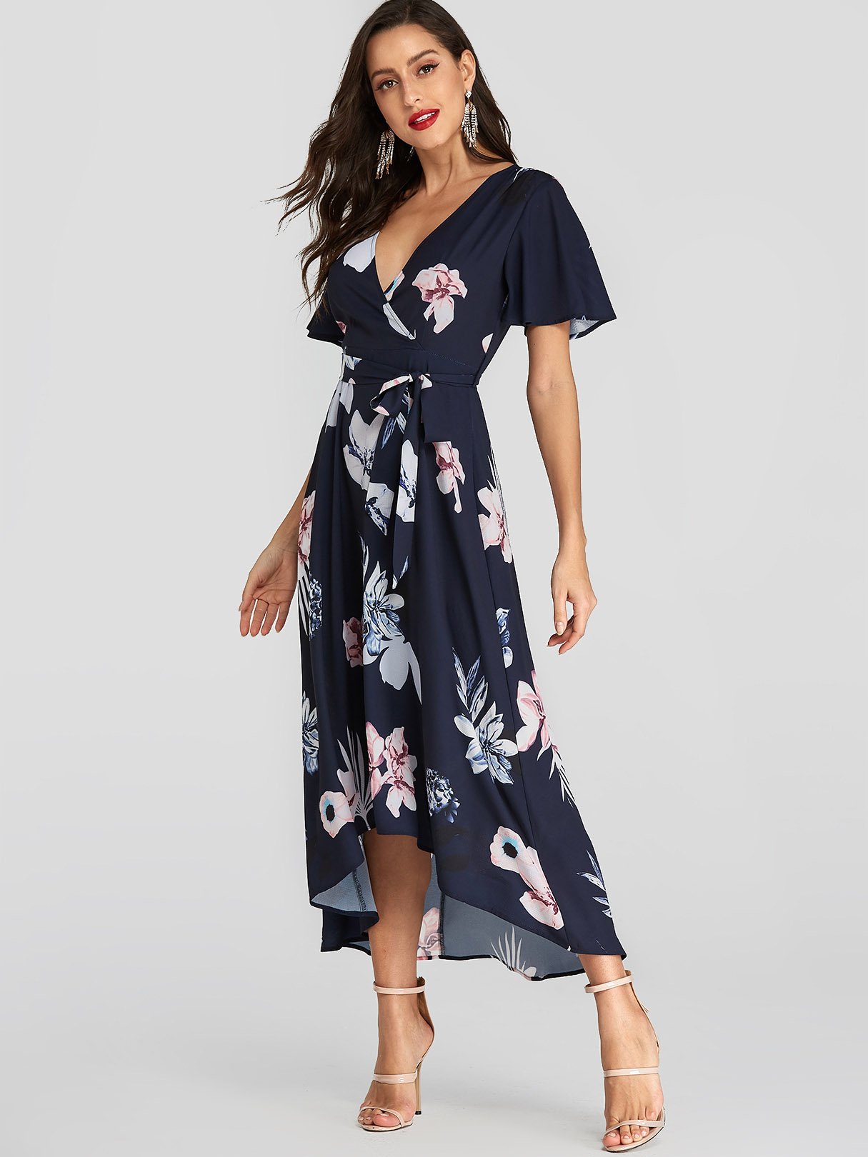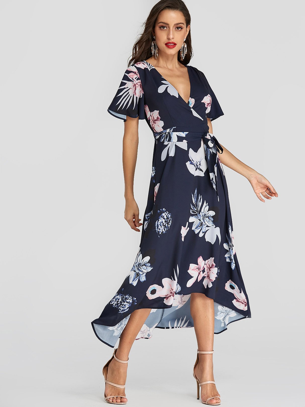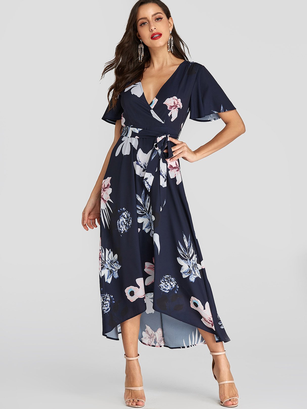 Navy V-Neck Short Sleeve Floral Print Belt Self-Tie Wrap Irregular Hem Dresses