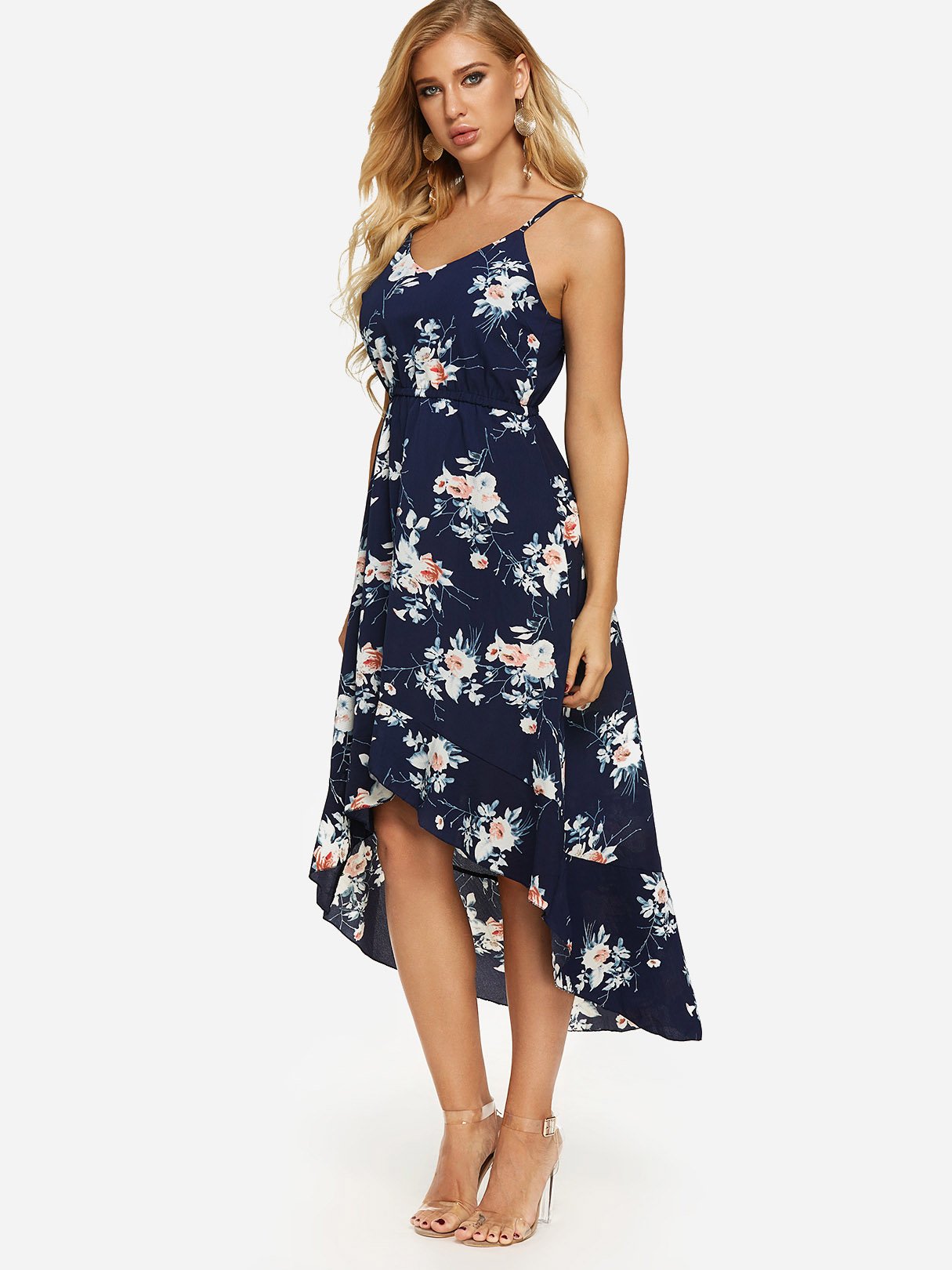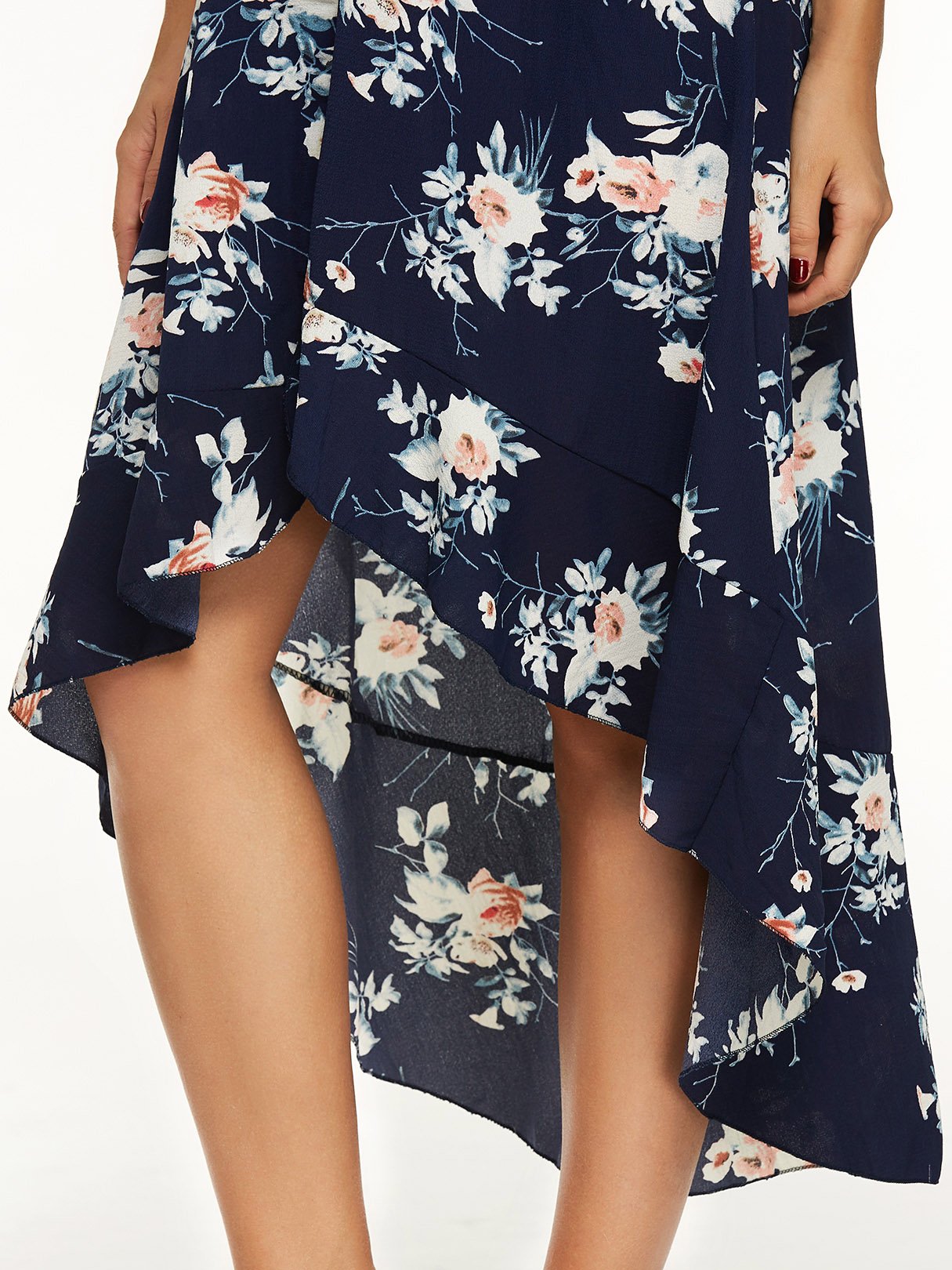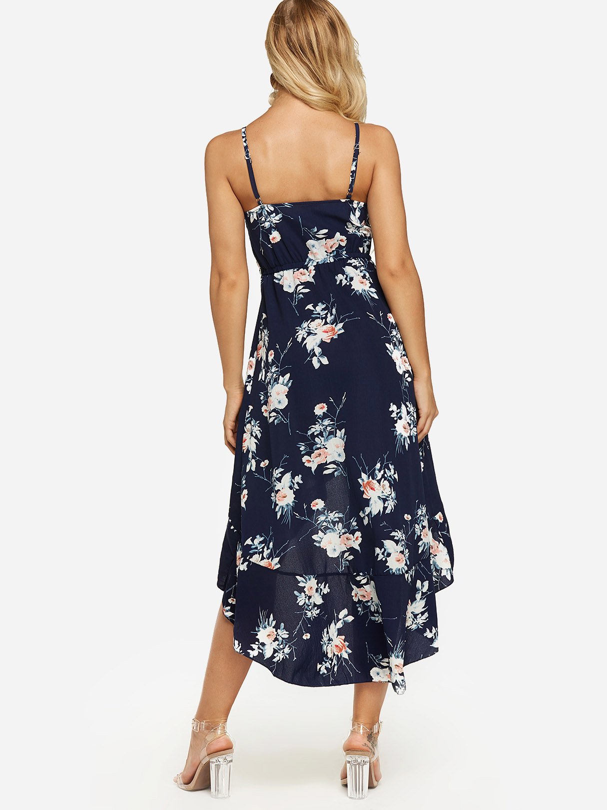 Navy V-Neck Sleeveless Floral Print Backless Spaghetti Strap Flounced Hem Dresses