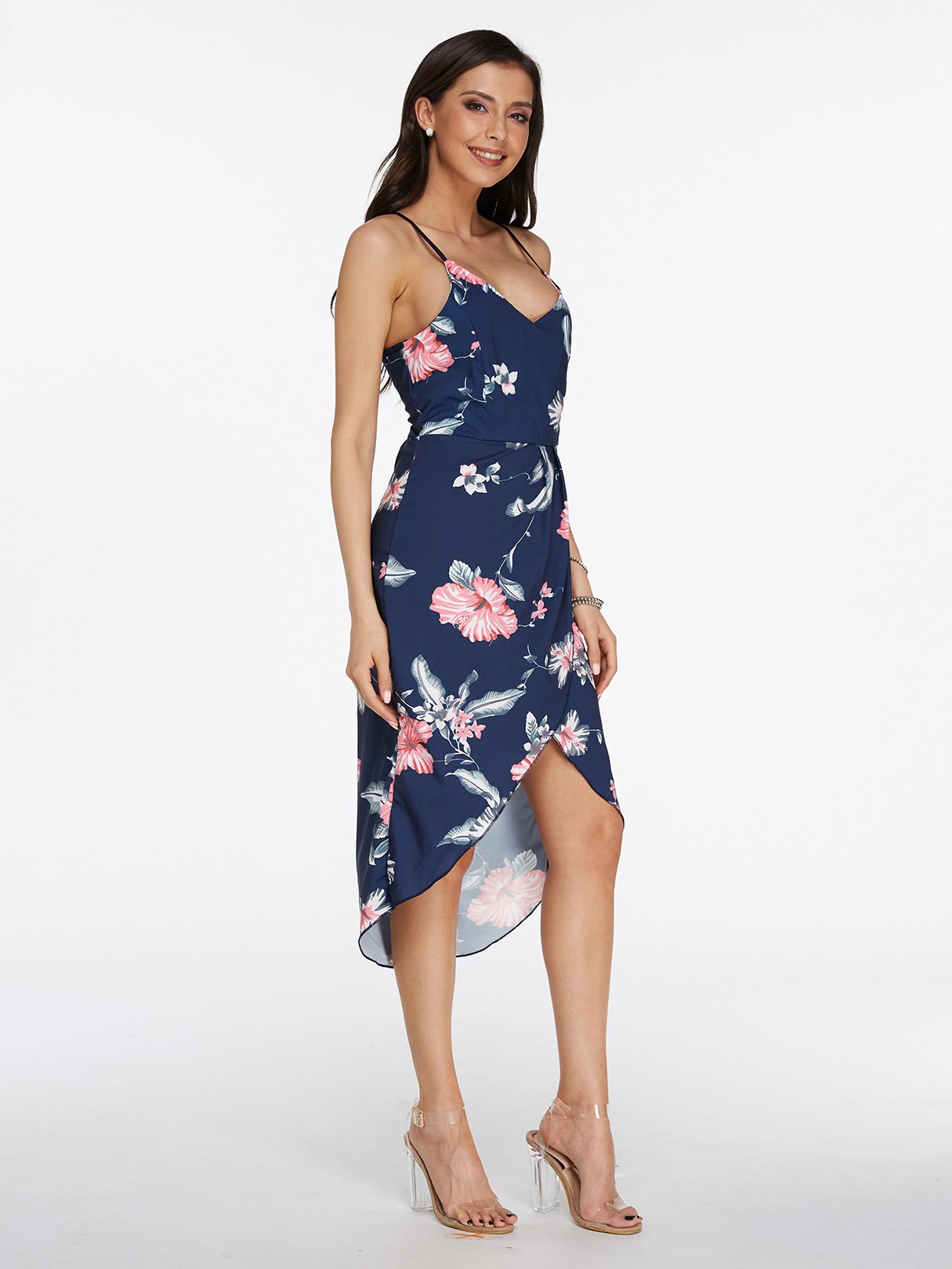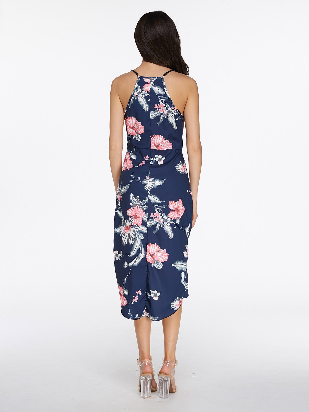 Navy V-Neck Sleeveless Floral Print Crossed Front Zip Back Slit Hem Dresses