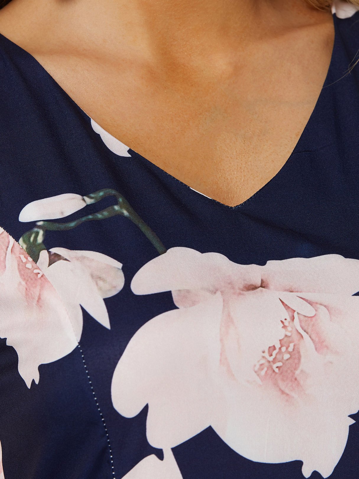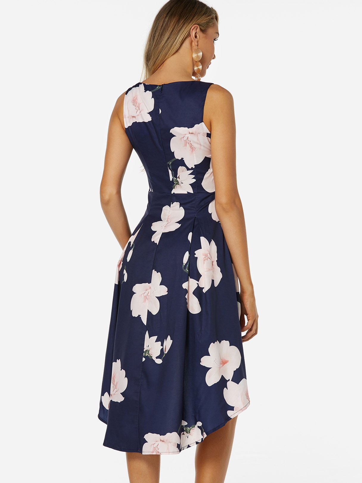 Navy V-Neck Sleeveless Floral Print Zip Back High-Low Hem Dresses - Navy / S is backordered and will ship as soon as it is back in stock.