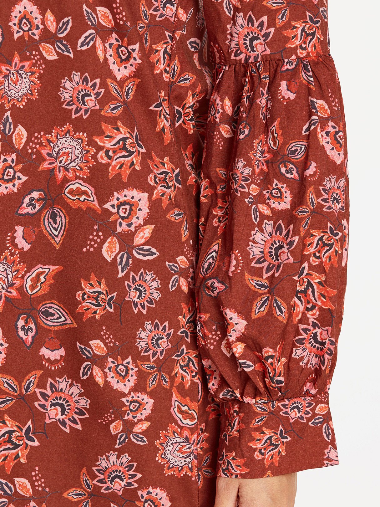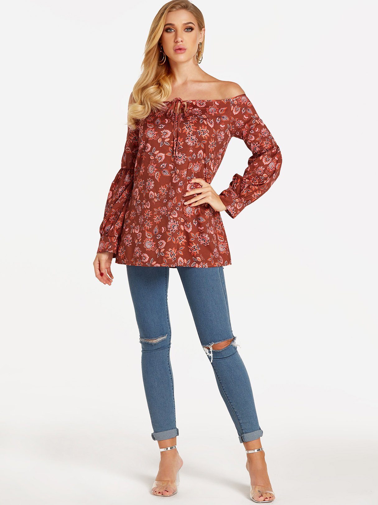 Off The Shoulder Floral Print Cut Out Long Sleeve Burgundy Blouses