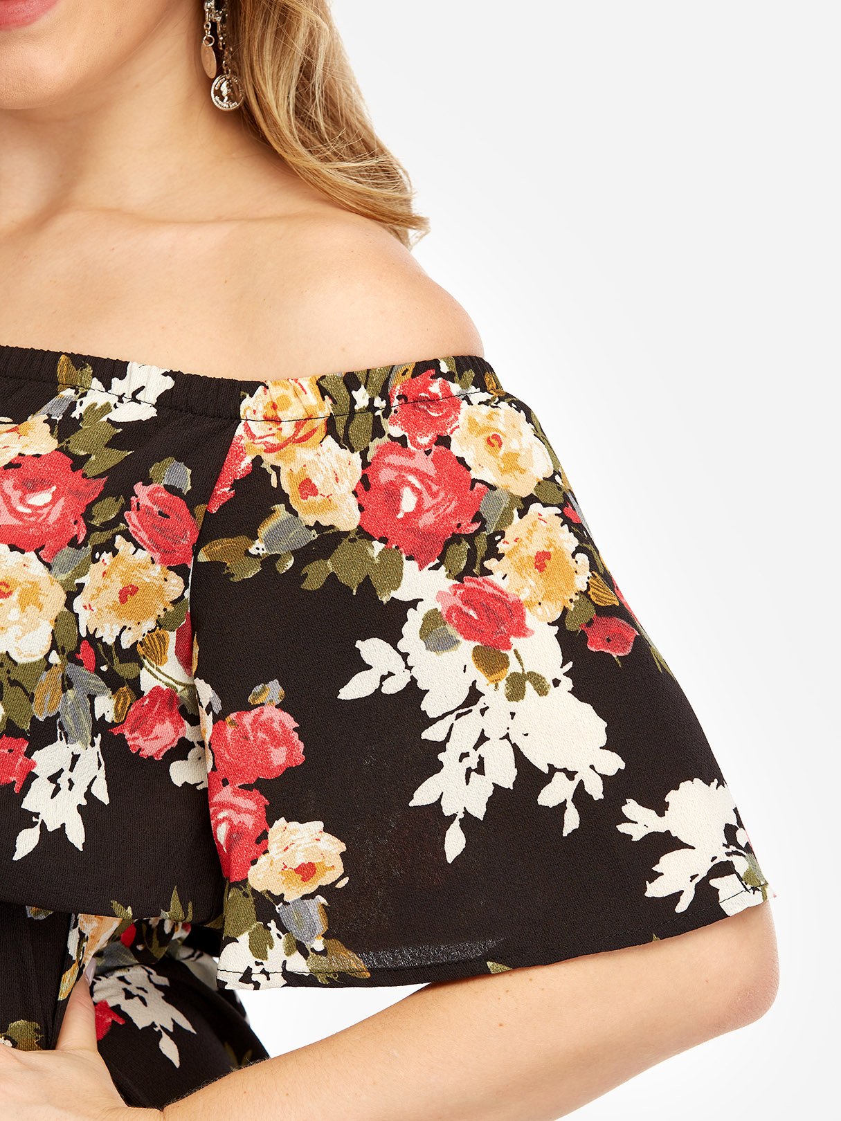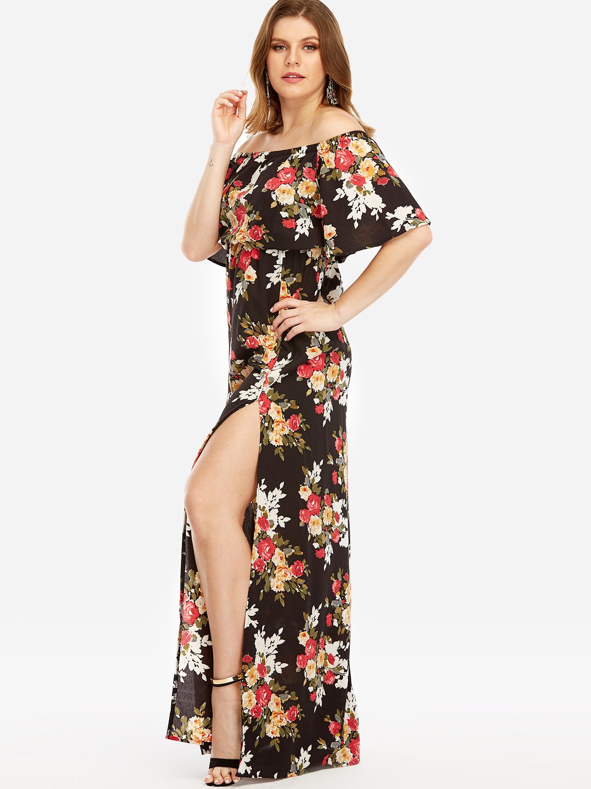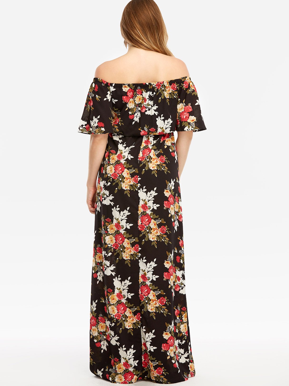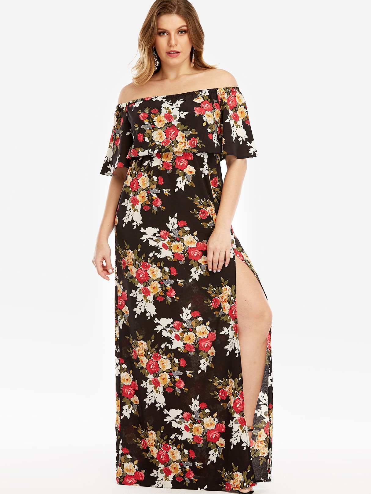 Off The Shoulder Floral Print Half Sleeve Slit Hem Black Plus Size Maxi Dress